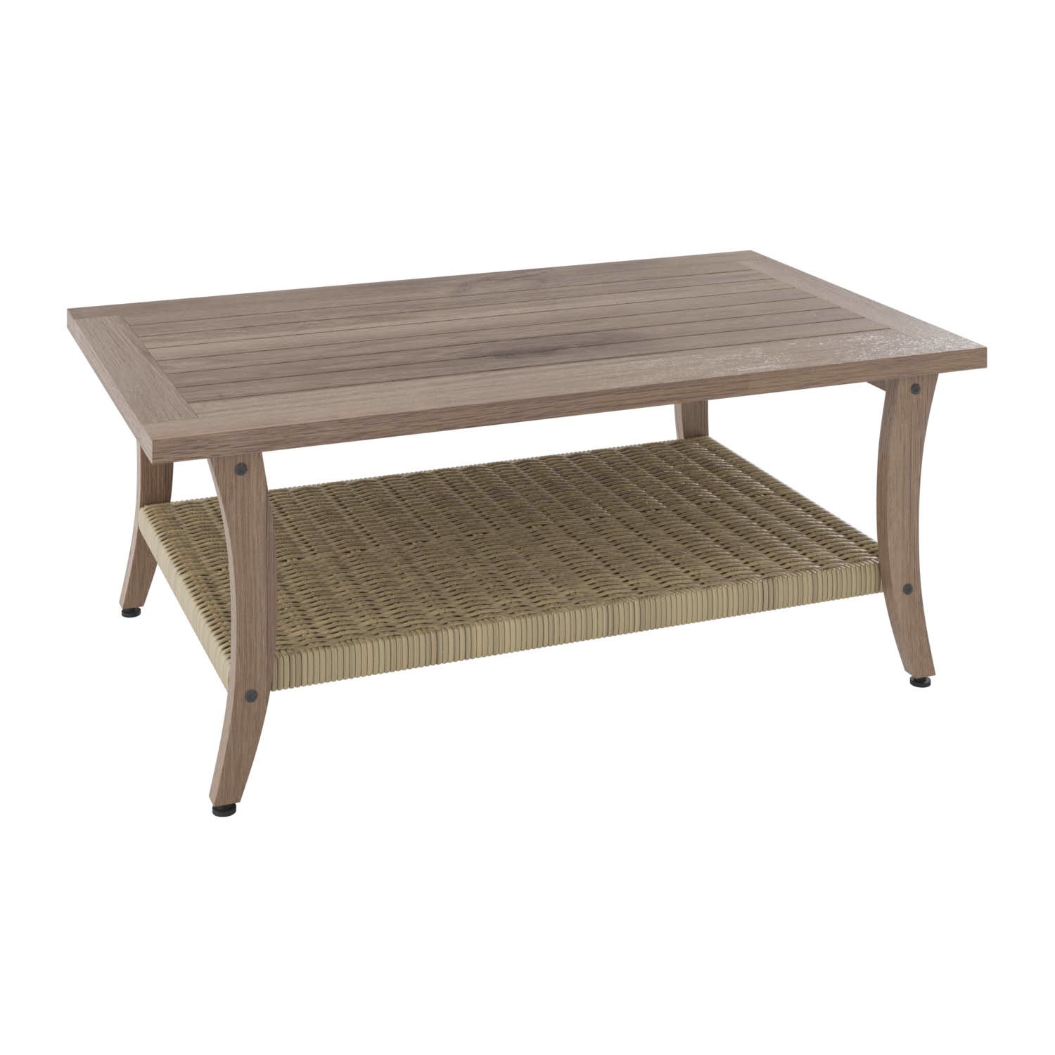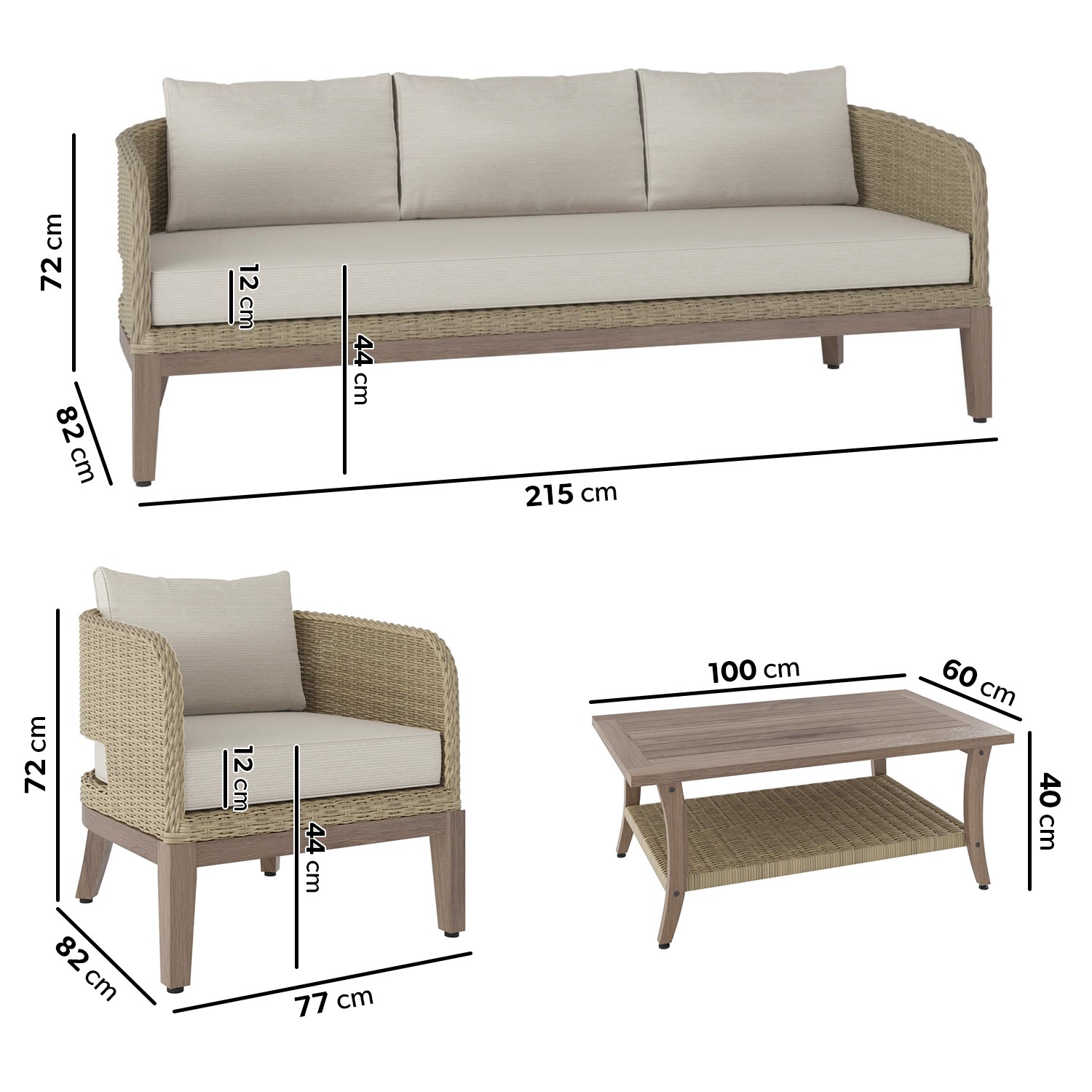 - Material: Twisted synthetic rattan effect, aluminium frames, acacia wood legs and tabletop, cotton-filled cushions