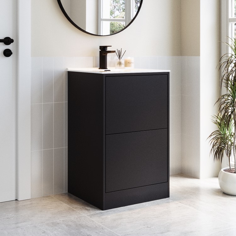 Modernise your bathroom with the Palma matt black basin vanity unit. Practical and stylish with clean lines, it is the perfect addition to your cloakroom or small bathroom. The two push to open drawers have a soft closing mechanism to prevent slamming, providing a quieter closure. The drawer opening distance is 255mm so plenty of room for all your bathroom essentials. A high-quality ceramic inset basin is included, which has one central tap hole; a tap isn't included, so you're free to choose one from our wide range. The basin comes with a pre-fitted chrome overflow but feel free to add on a different overflow cover to match your tap. This vanity unit requires no assembly, secure the basin then install your chosen tap and waste. This unit has a 2 years warranty for added peace of mind.
