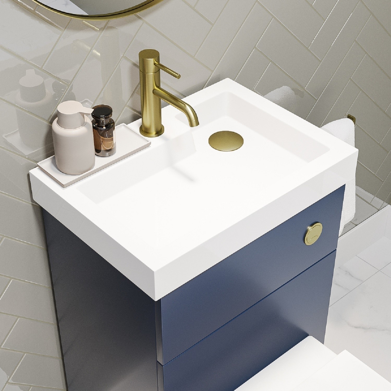 Transform your cloakroom bathroom with this creatively designed space saving matt blue toilet and sink unit and brushes brass fittings. With the sink on top of the unit, all pipework is hidden away inside which is great for a clean and minimal bathroom. Paired with our modern square shape back to wall toilet with rimless design for easy cleaning and quick-release, soft close seat.