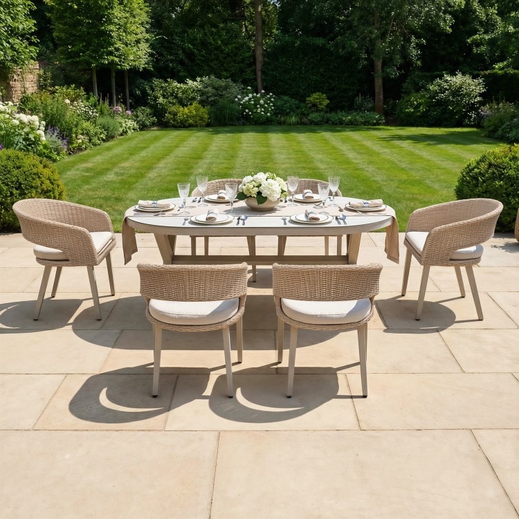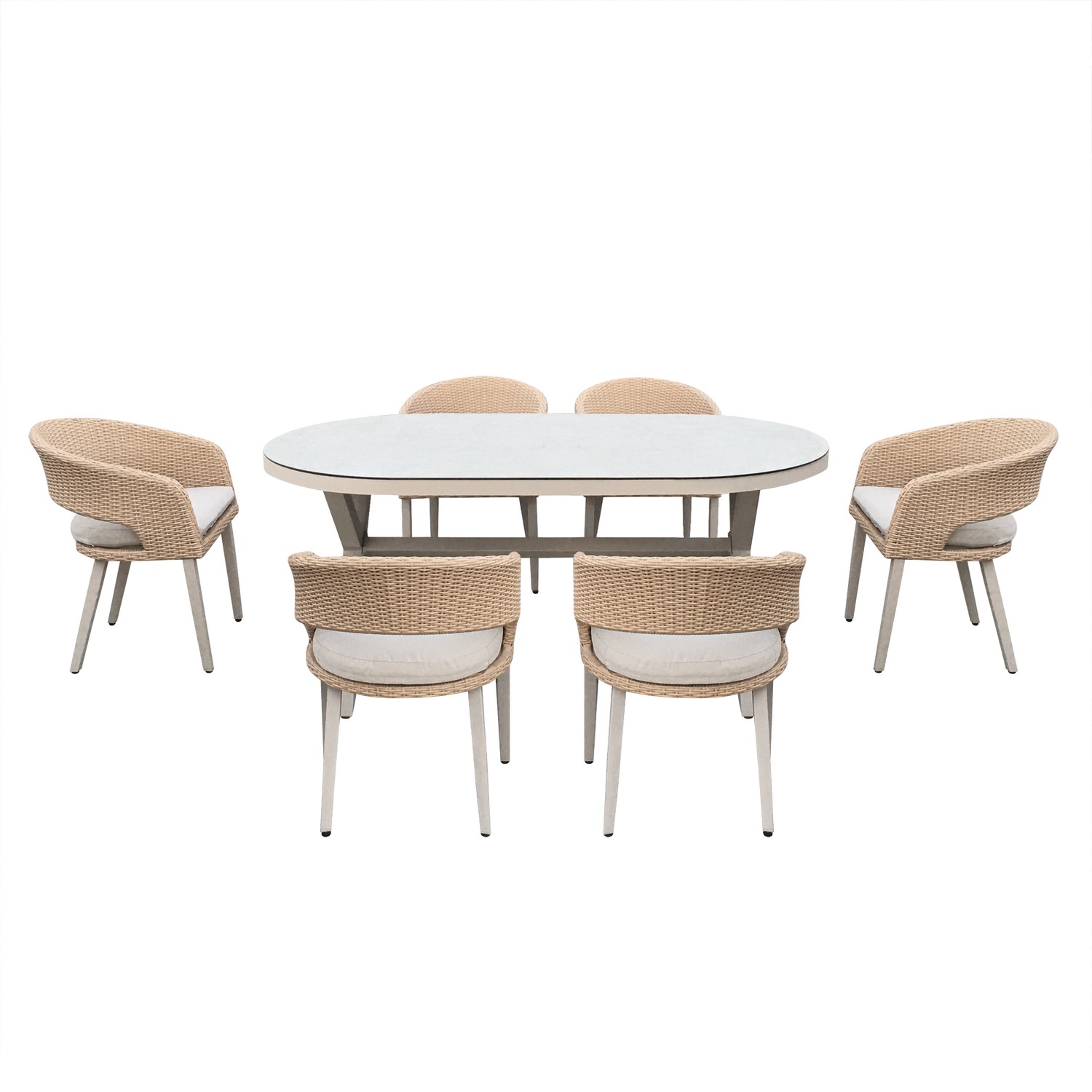 - Finish: Rattan weaving, aluminium frame, ceramic effect tabletop