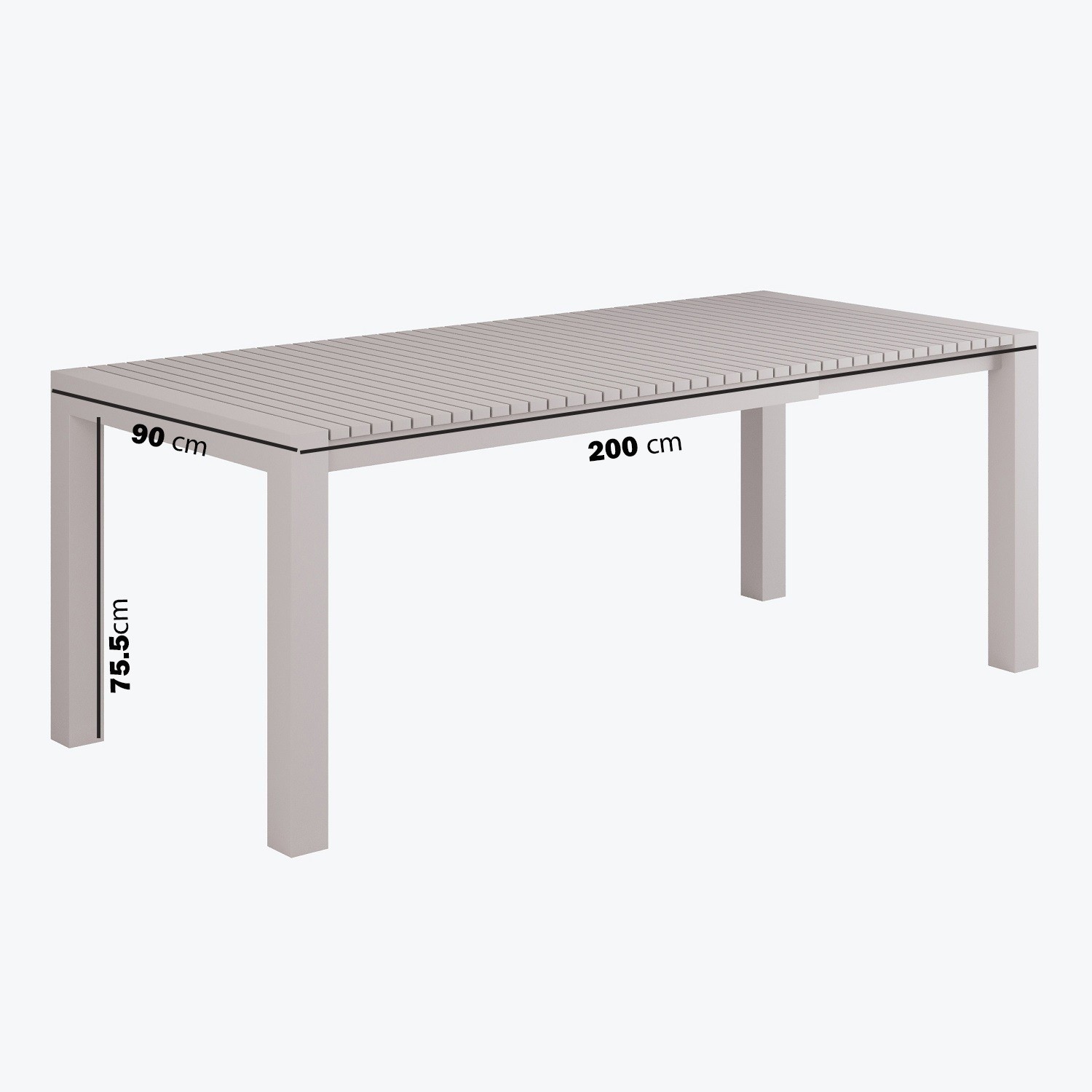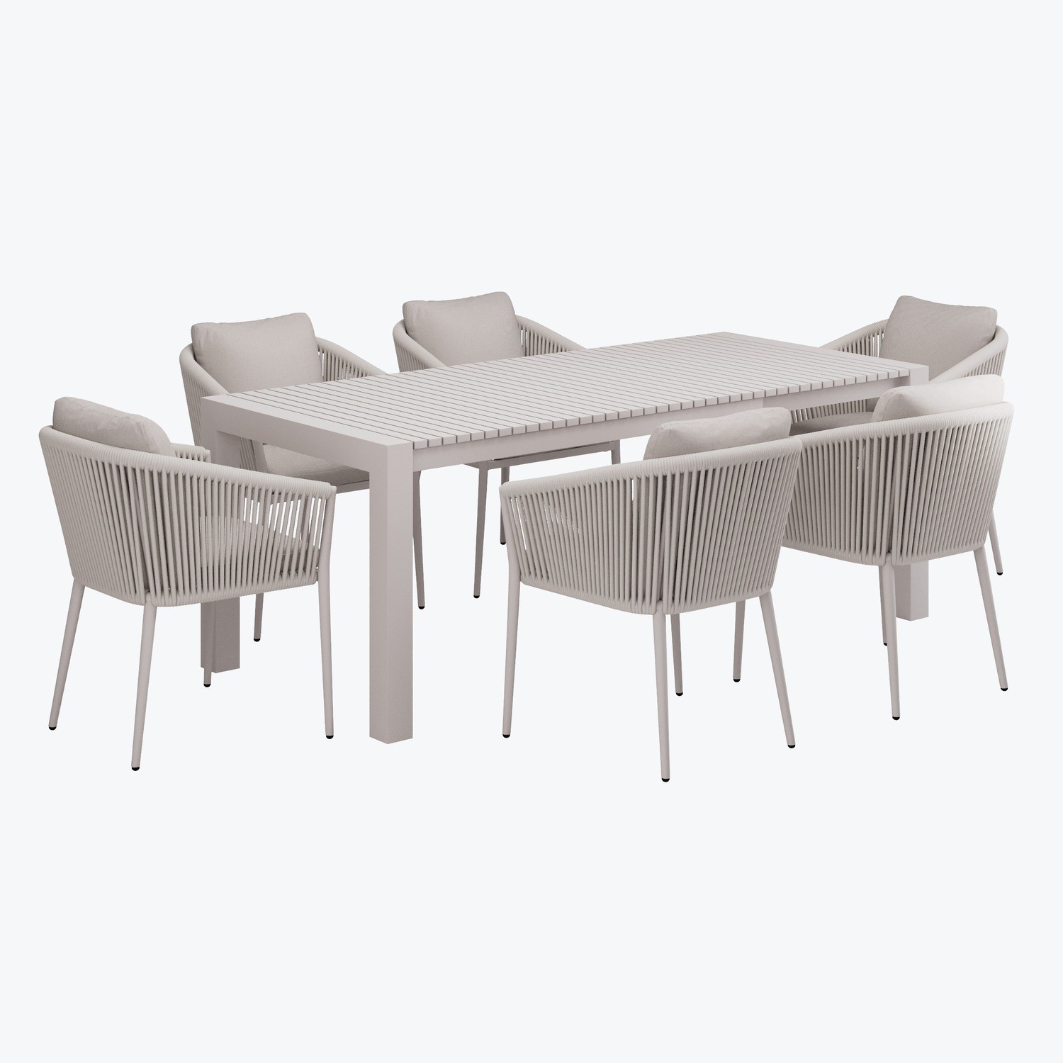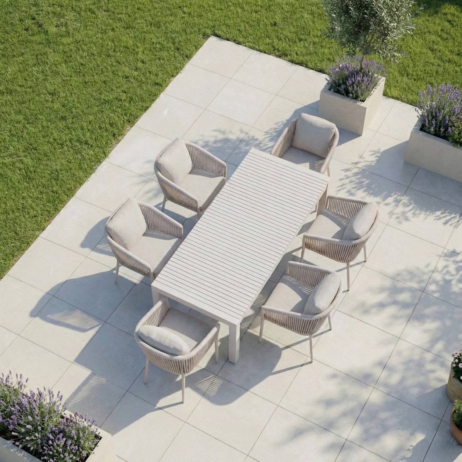 Designed for effortless outdoor entertaining, this extendable dining set combines clean-lined contemporary style with practical versatility. The spacious rectangular table features a slatted top and a smooth extension function, allowing you to adapt your dining space as guests arrive. Six coordinating armchairs showcase elegant woven rope detailing and plush cushions, creating a comfortable and inviting setting for everything from casual lunches to evening gatherings. Crafted with a durable aluminium frame in a timeless neutral finish, this set offers both style and resilience for seasons of outdoor enjoyment.