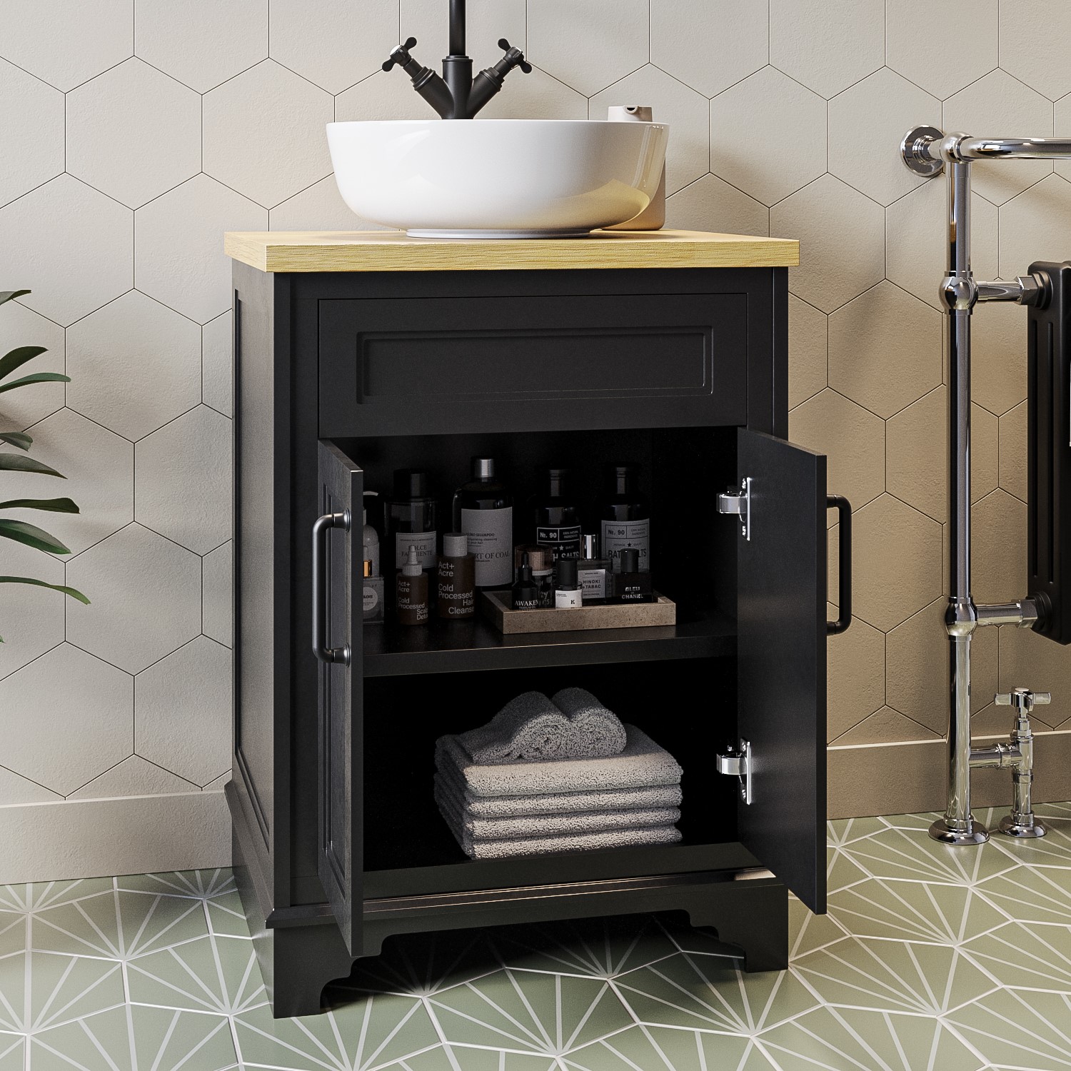 The black metal handles give the unit an industrial edge and open to reveal an interior shelf with room to store all your toiletries and other essentials. It even has soft closing hinges to prevent slamming and unnecessary damage. The unit requires no assembly, secure the basin then install your chosen tap, and you’re free to use it right away. Why not check out the rest of the Camden range to complete the look.