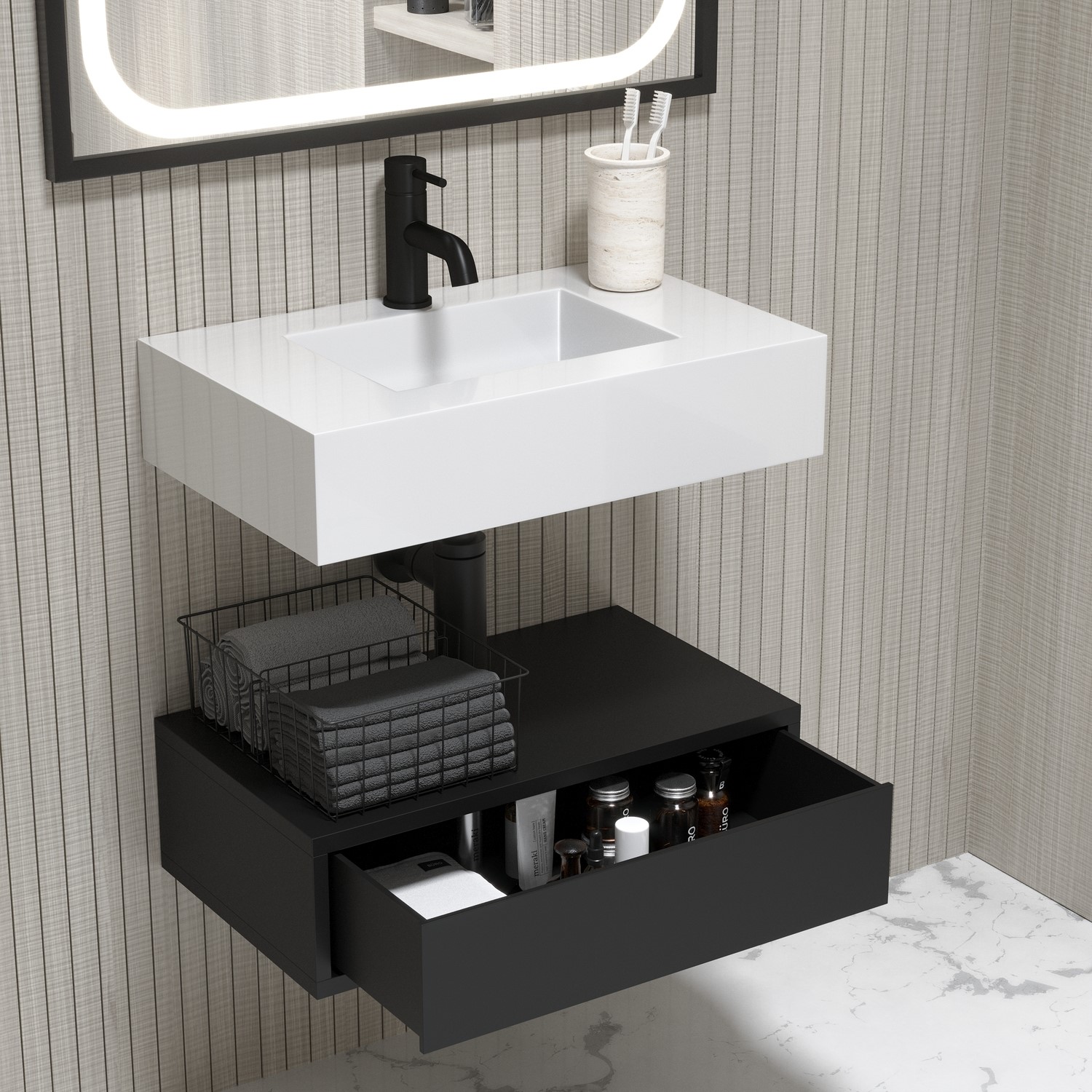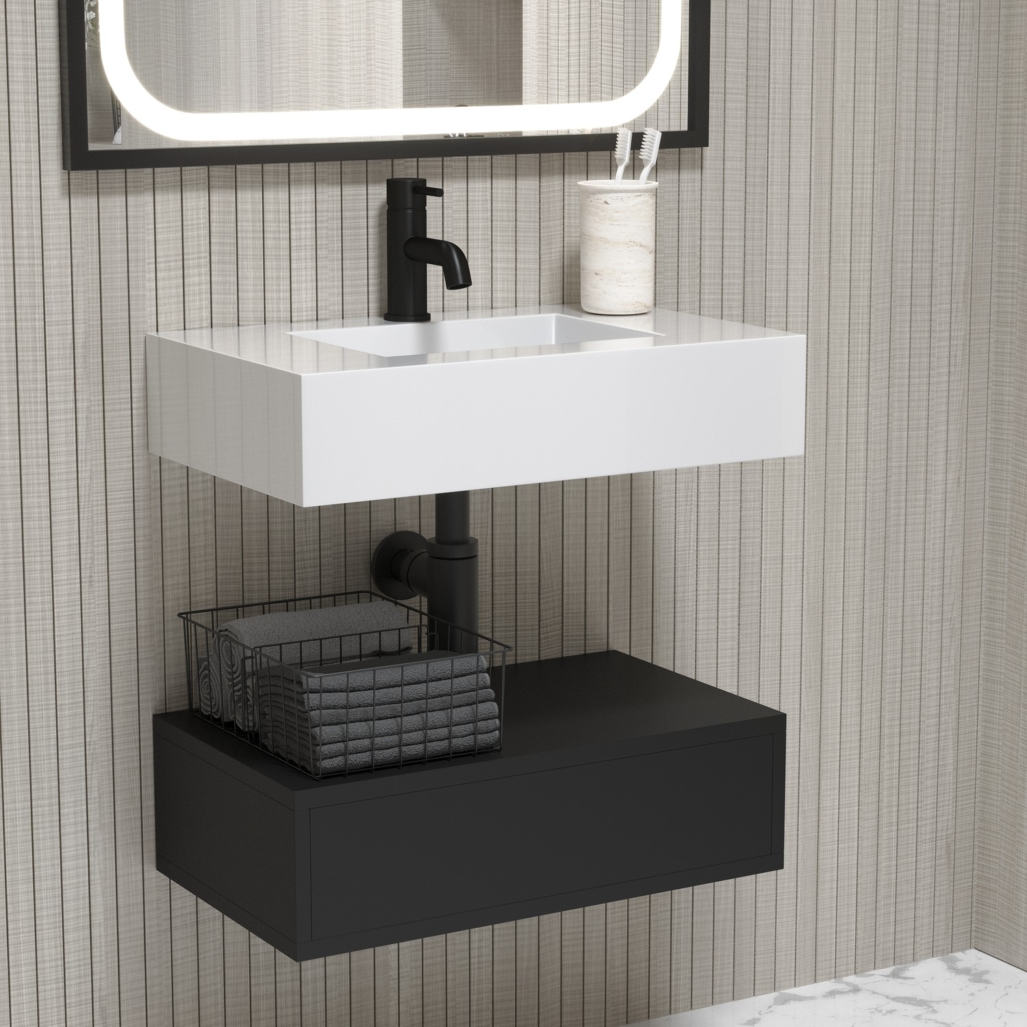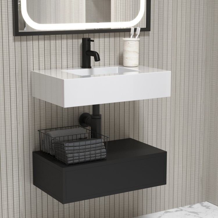 The 600mm Oslo basin and matt black floating vanity unit is perfect for modern bathrooms. The rectangular white resin basin offers durability and elegance, with its easy-to-clean surface and resistance to everyday use. This basin is designed with both functionality and style in mind. Its gently sloping interior naturally directs water to the back, where the discreet integrated waste ensures efficient free-flowing drainage. The integrated waste enhances its streamlined aesthetic, while seamlessly blending with the basin and will match any bathroom colour schemes.