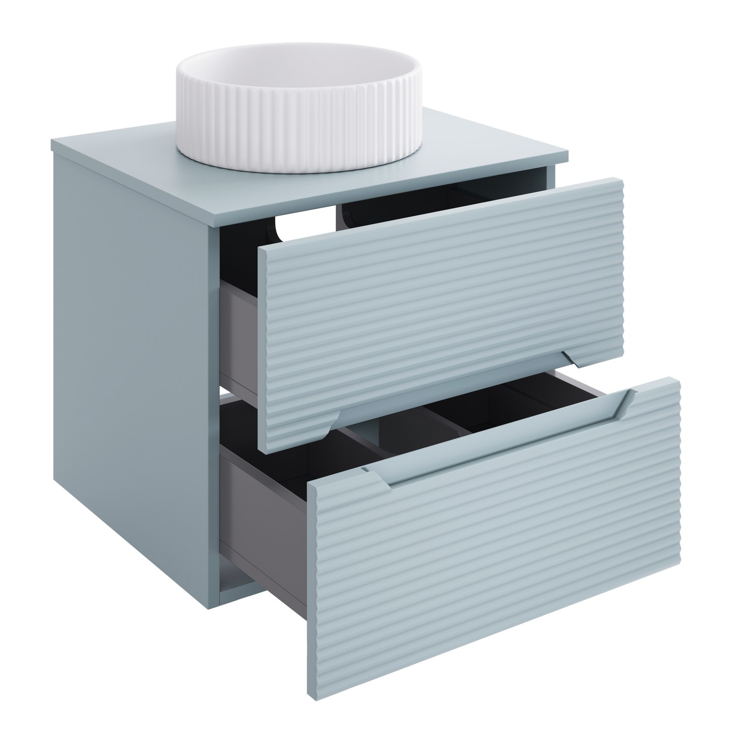 The vanity is paired with a beautifully matched fluted countertop basin. The sink is made of high quality ceramic, and finished in a white gloss making cleaning a breeze. Measuring at 360mm, the basin provides ample space on your worktop to decide whether to install a tall basin mixer or a wall-mounted tap for a truly personalised touch. Designed with two soft-close drawers, it provides generous storage for your bathroom essentials, keeping your space clutter-free and organised. The discreet integrated handles allow the drawers to open smoothly, completing the unit’s streamlined and modern finish.
