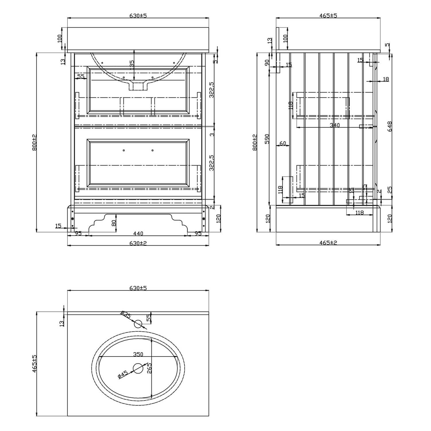 - Overall footprint dimensions (including basin unit): H800 x W630 x D465 mm
