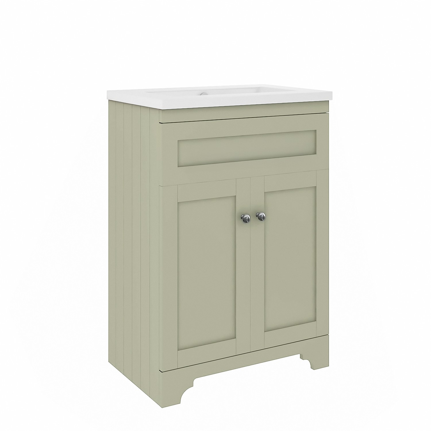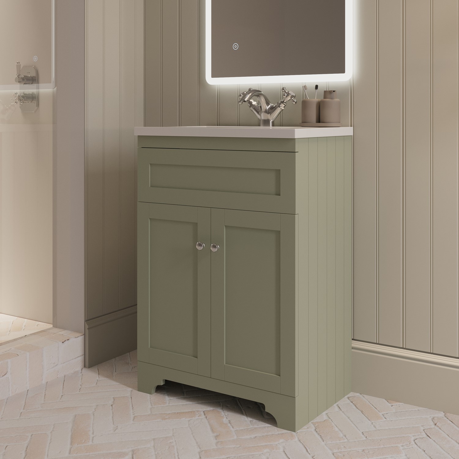 Transform your bathroom with this charming Baxenden freestanding 600mm vanity unit, finished in a trendy matt sage. The traditional styling features classic tongue-and-groove side panelling, shaker doors and ornate front skirting details to add a feature piece to your bathroom. This vanity unit makes brilliant use of smaller bathrooms with its 600mm width whilst still providing ample storage with a shelved cupboard behind the soft close doors.