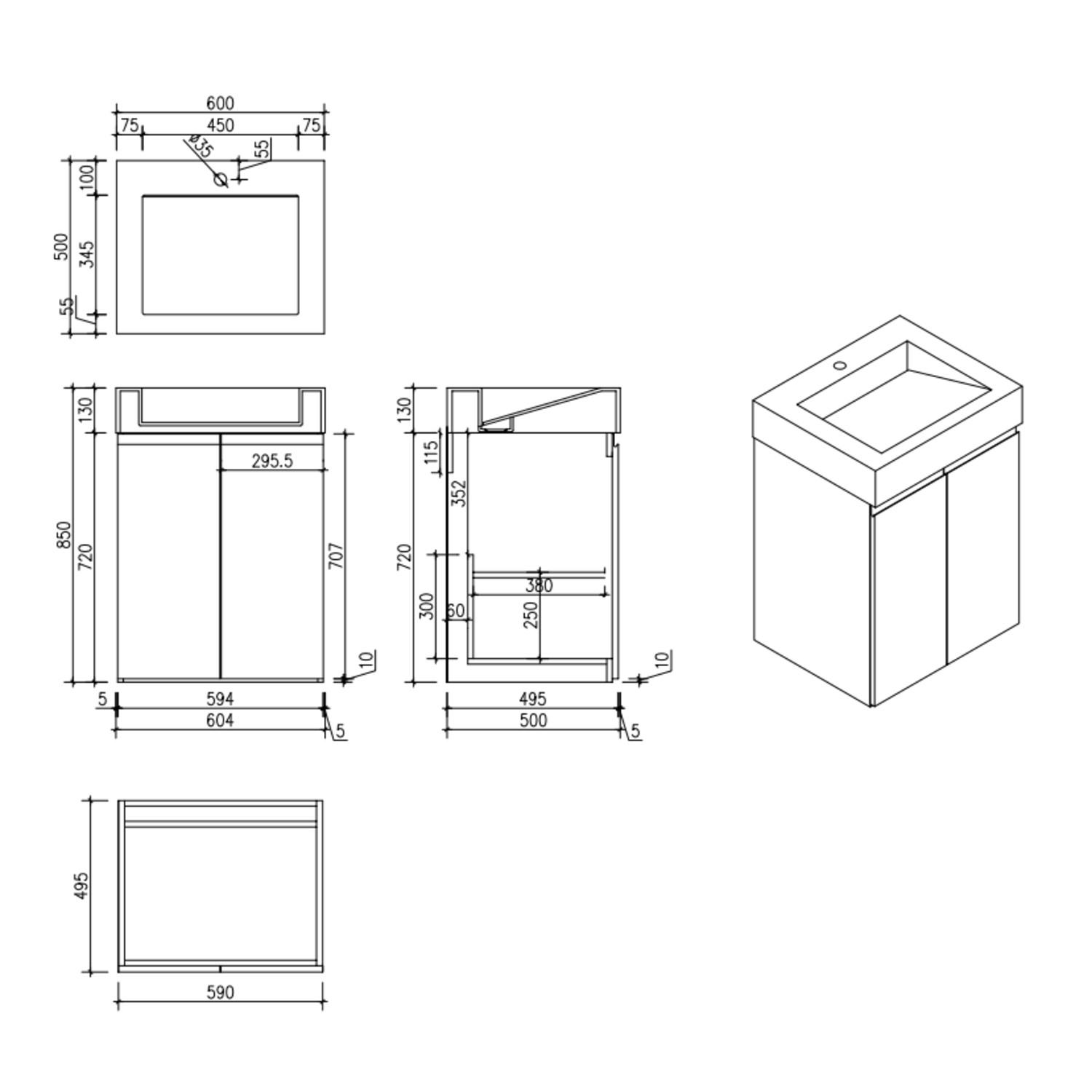 - Overall Basin Vanity Dimensions (including basin): H850 x W604 x D500 mm