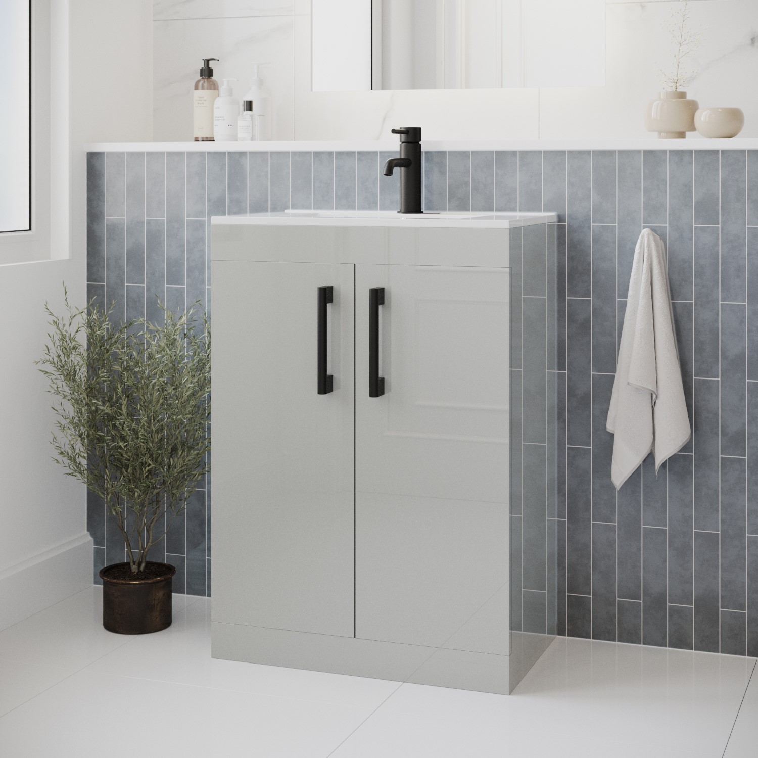 Make a statement in your bathroom with this Ashford freestanding vanity basin unit. Practical and stylish with clean lines, it's perfect for the modern bathroom. The two doors with matt black handles each have a soft-closing mechanism to prevent slamming, providing a quieter closure. A high-quality ceramic inset basin is included, which has one central tap hole; a tap isn't included, so you're free to choose one of your choice. This vanity unit requires no assembly, secure the basin then install your chosen tap and get to using it right away.