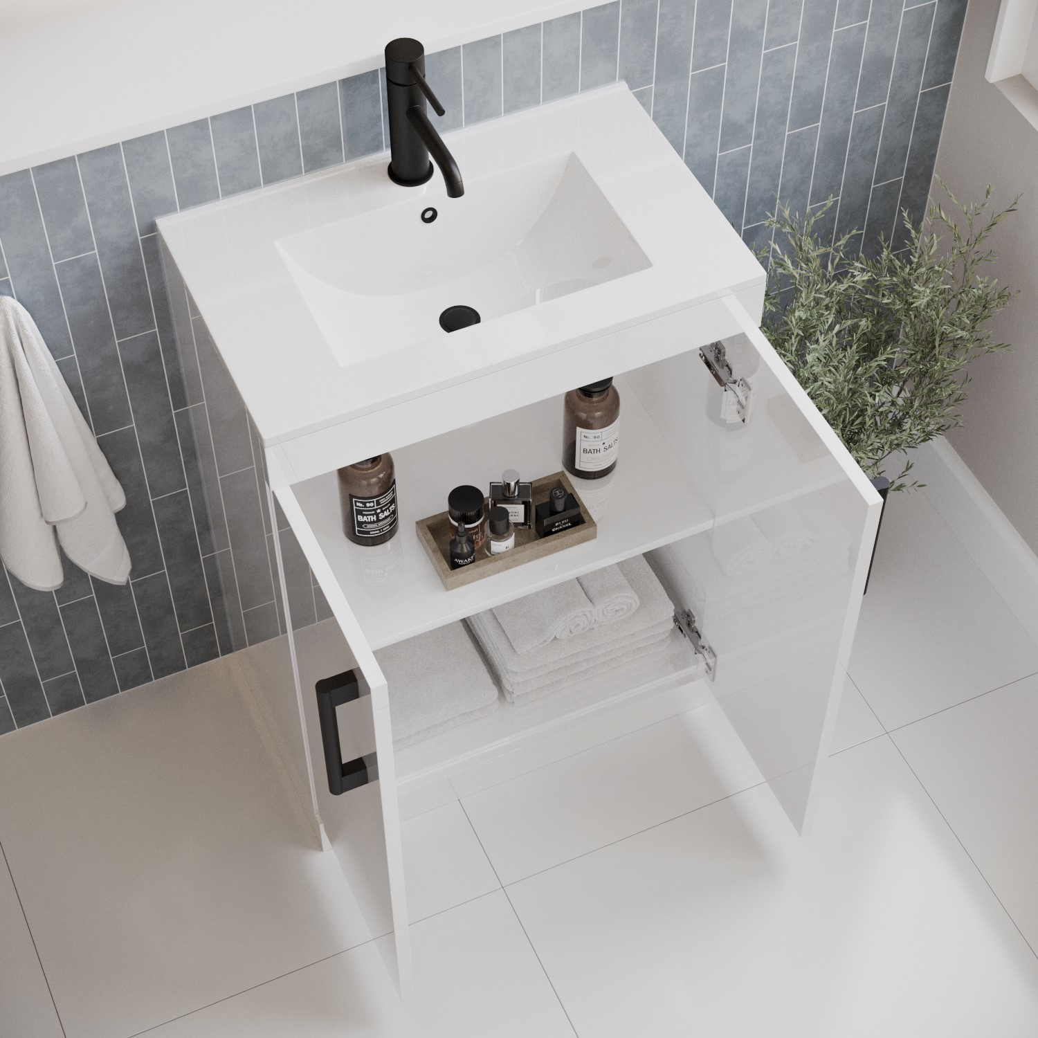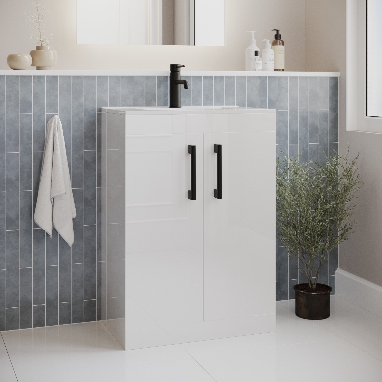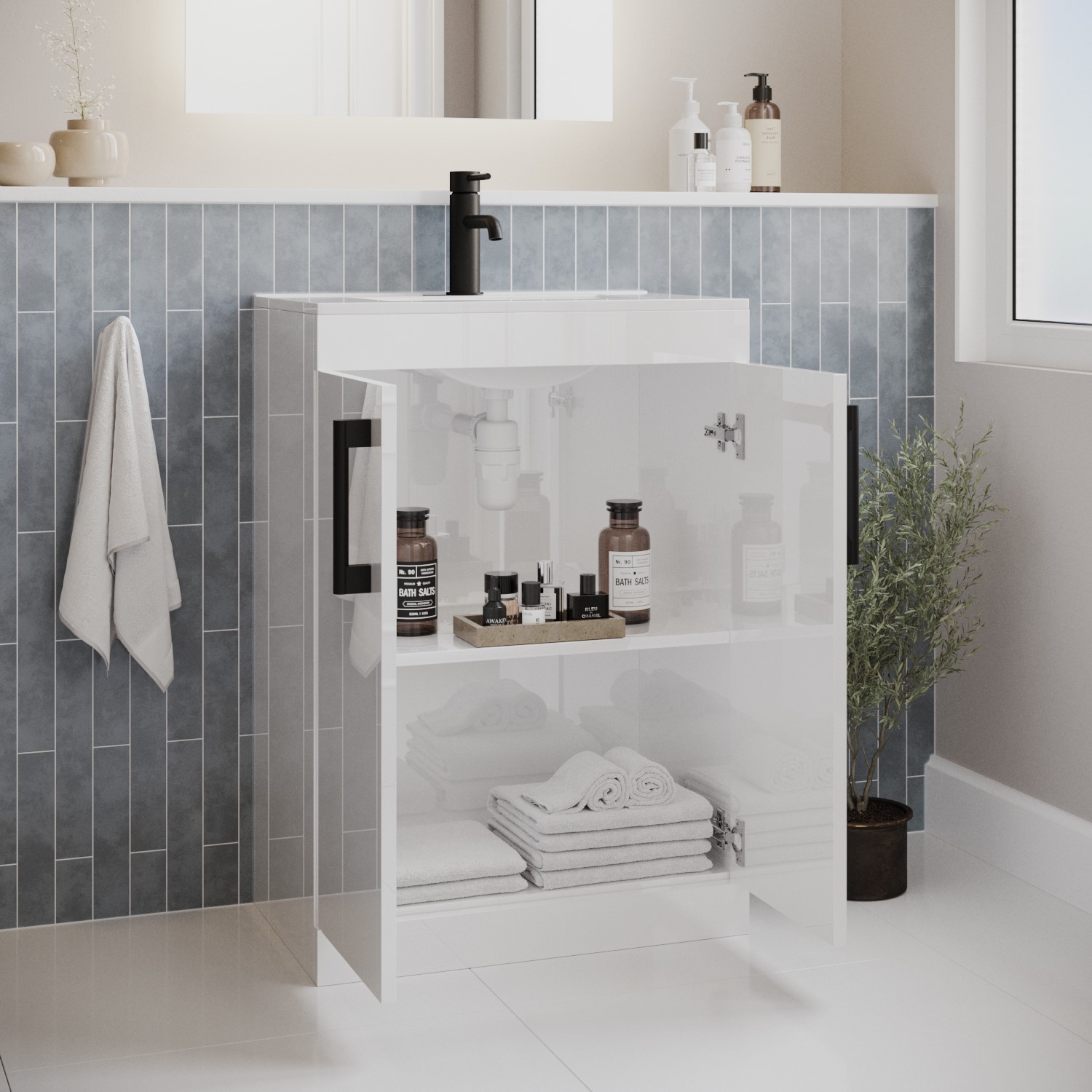Update your bathroom with this modern Ashford freestanding 600mm vanity unit, finished in a clean white gloss. The vanity unit is equipped with matt black handles for easy opening which match the included overflow, and the white gloss finish instantly brightens your bathroom whilst being easy to wipe down and clean. Store your essentials with the ample storage space with a shelved cupboard behind the soft close doors, making it perfect for family bathrooms.