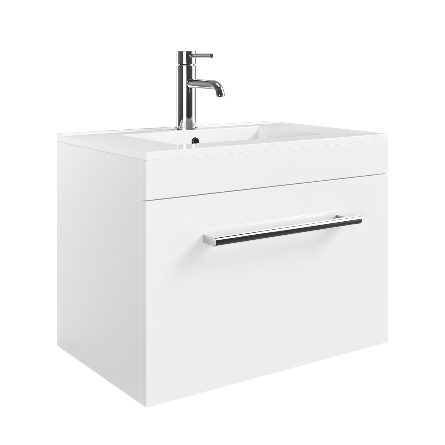 Update your bathroom with this modern Ashford wall hung 600mm vanity unit, finished in a clean white gloss. The vanity unit is equipped with a chrome handle for easy opening which match the included overflow, and the white gloss finish instantly brightens your bathroom whilst being easy to wipe down and clean. Store your essentials in the spacious deep drawer for quick access, which is equipped with soft-closing runners for quiet operation.