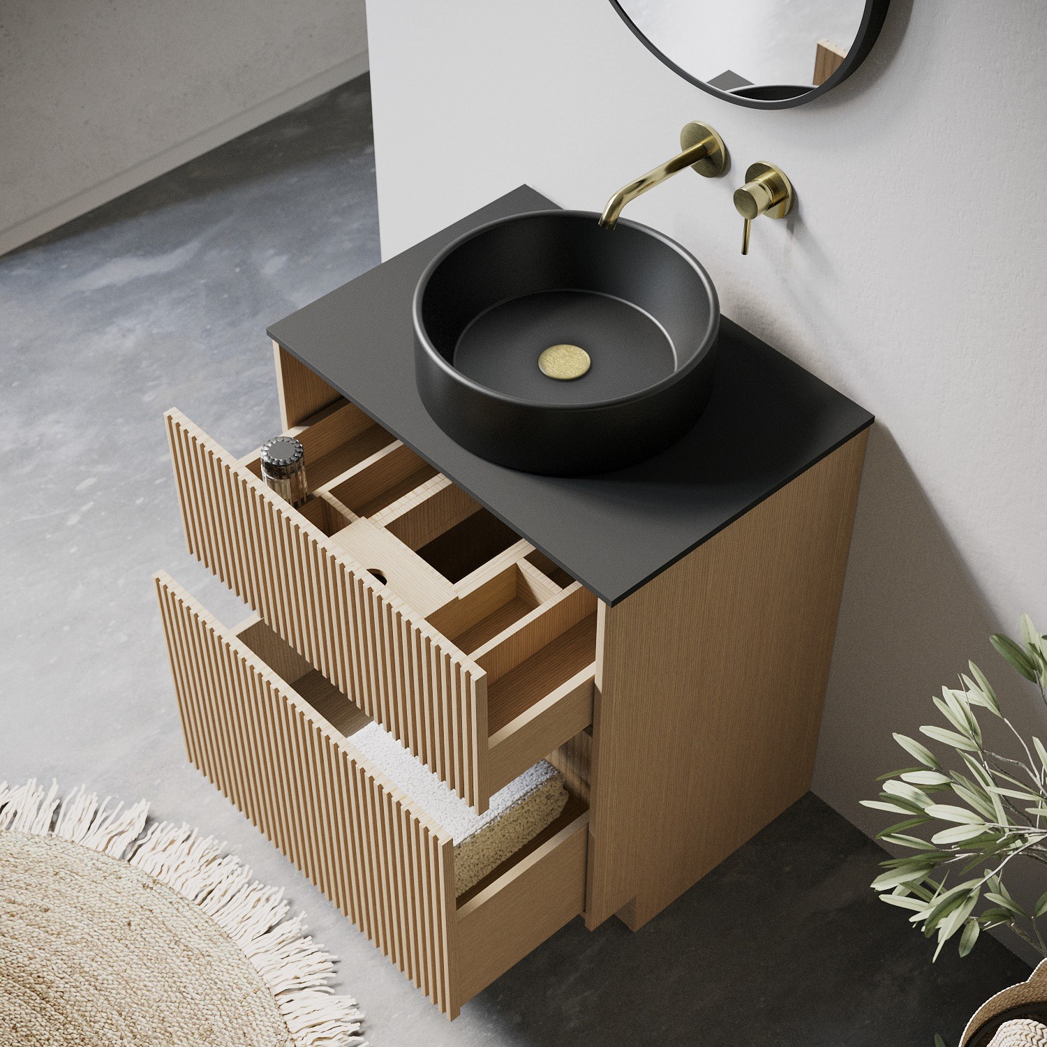 Elevate your bathroom with our fluted Matira vanity unit with a round basin, adding a modern luxurious touch to your home. The sleek push-to-open and soft-close mechanism prevents slamming, reducing wear and tear for long-lasting durability. Simply pair it with your preferred wall mounted tap for a chic final touch. The Matira range showcases meticulous attention to detail and expert craftsmanship, finished with a wood veneer and features a sintered stone worktop. This freestanding vanity unit provides space-saving solutions, boasting two deep Ribbed drawers equipped with push-to-open functionality and soft-closing mechanisms, offering ample storage space.