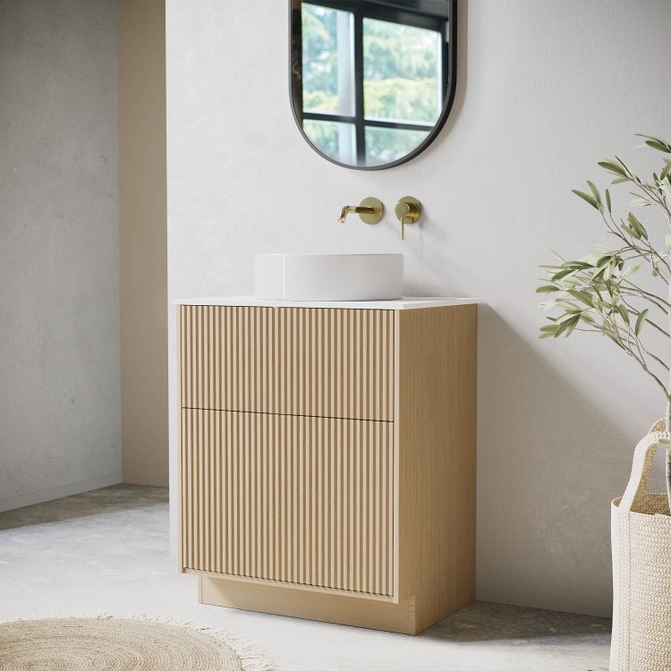 Contemporary Fluted Design : Elevate your bathroom with this contemporary freestanding vanity featuring a natural oak fluted design and minimalist aesthetic.