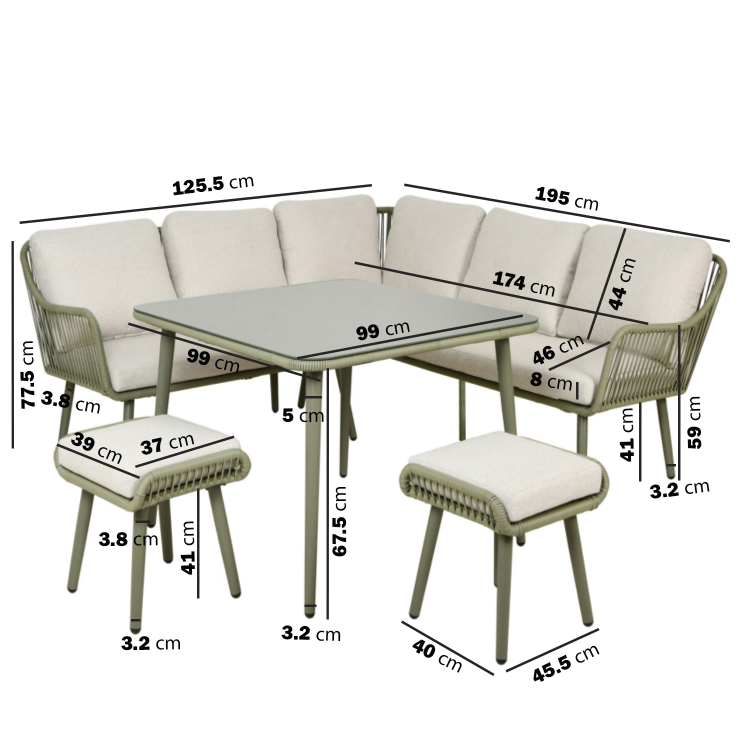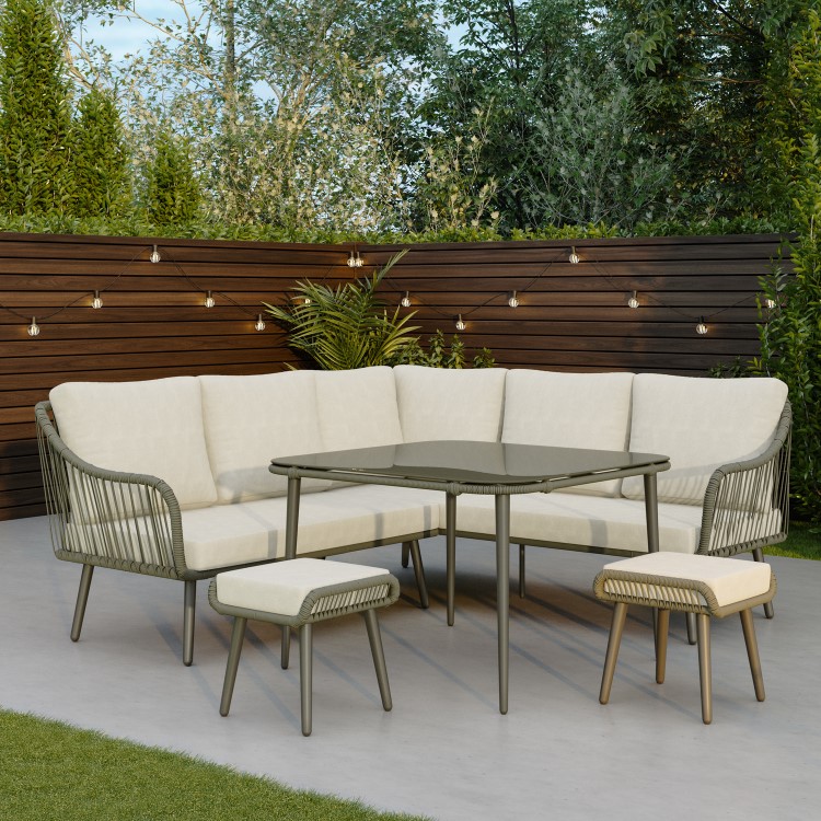 Bring a refined, modern look to your outdoor space with this green rope corner garden dining set. Designed for both style and practicality, it combines a spacious seating arrangement with a sleek dining-height table, making it perfect for everything from casual meals to social gatherings. The woven rope detailing introduces texture and a contemporary edge, while the neutral cushions soften the overall look for a balanced, inviting feel. Thoughtfully designed with additional stools that can be neatly tucked away, it offers flexibility without compromising on space. Built from durable materials including a powder-coated steel frame and tempered glass tabletop, and complete with a protective cover, this set is made for effortless outdoor living with a premium finish.
