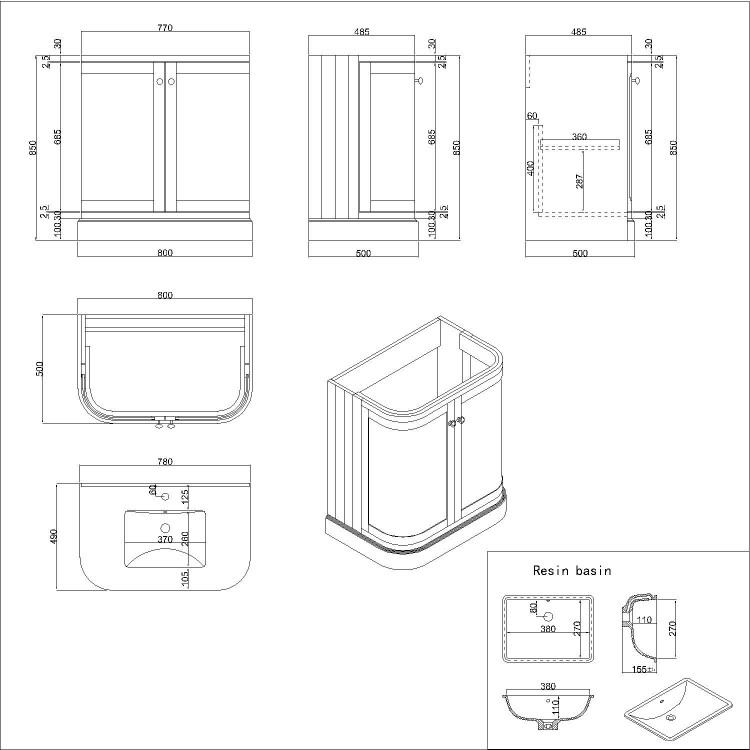 - Overall Basin Vanity Dimensions (including basin): H850mm x W800mm x D500mm