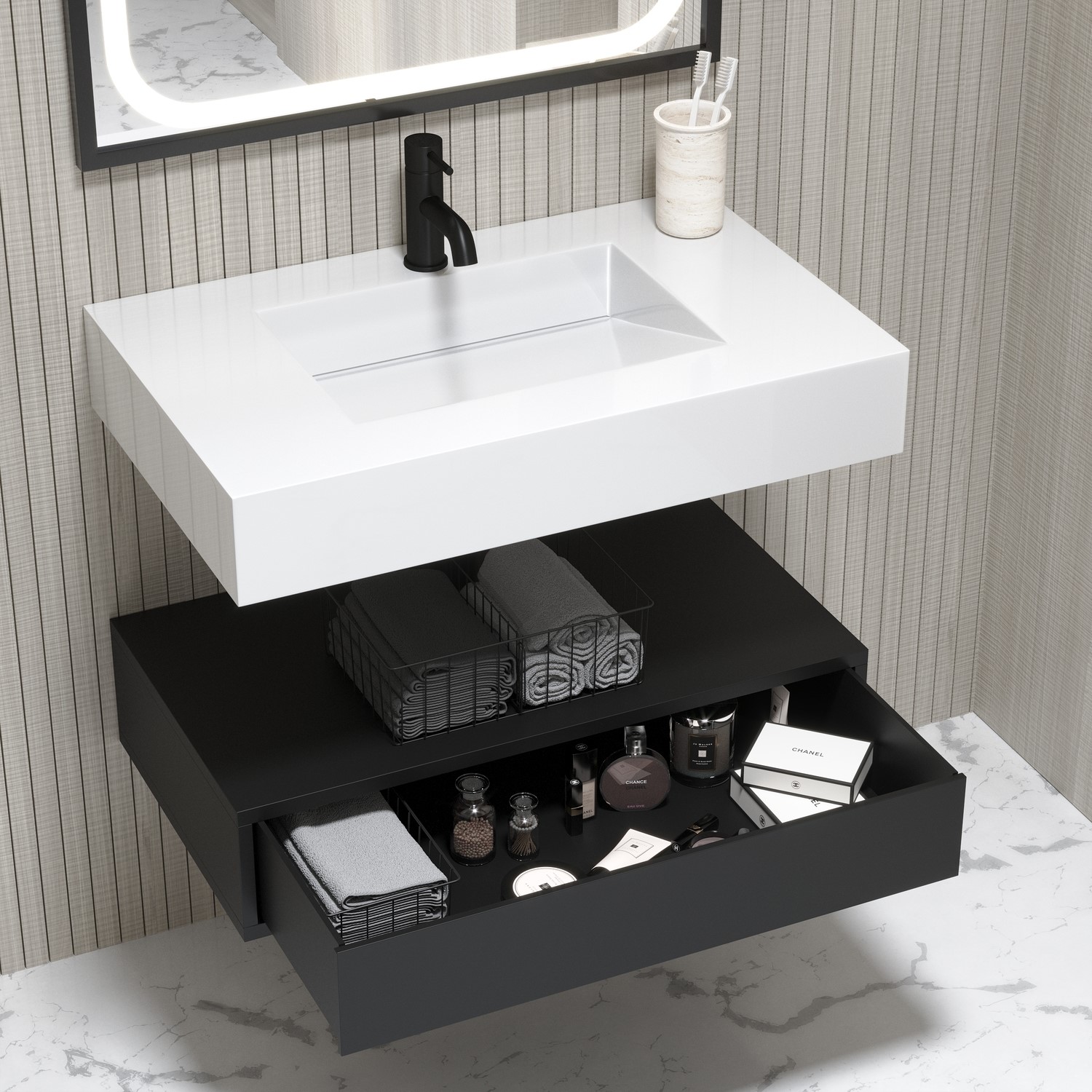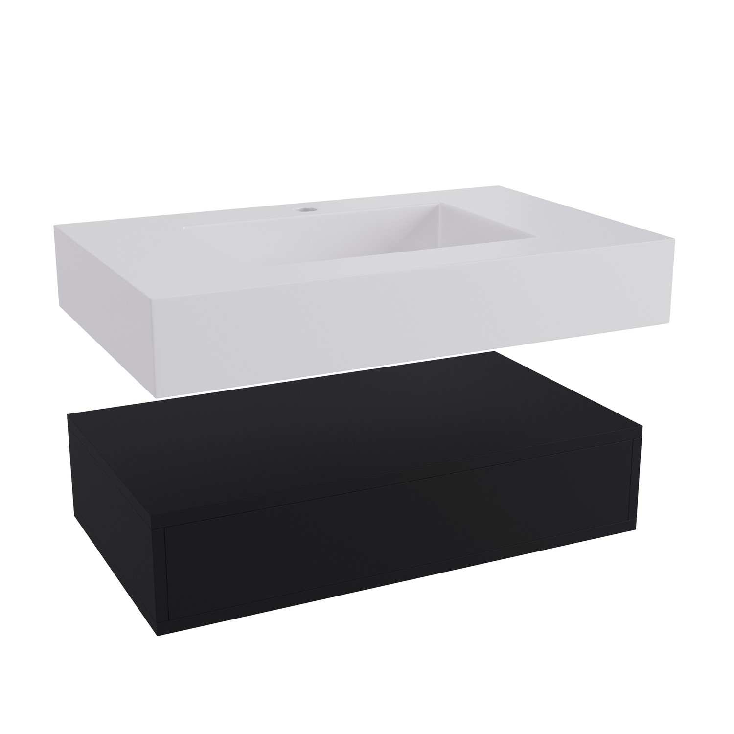 Upgrade your bathroom with the 800mm Oslo basin and matt black floating vanity unit. This unit features a durable resin basin with a sleek, wall hung design, paired with a matt black drawer unit that offers ample storage while maintaining a minimalist aesthetic. The wall hung setup helps to open up floor space, creating the illusion of a larger, more open bathroom, perfect for modern living.