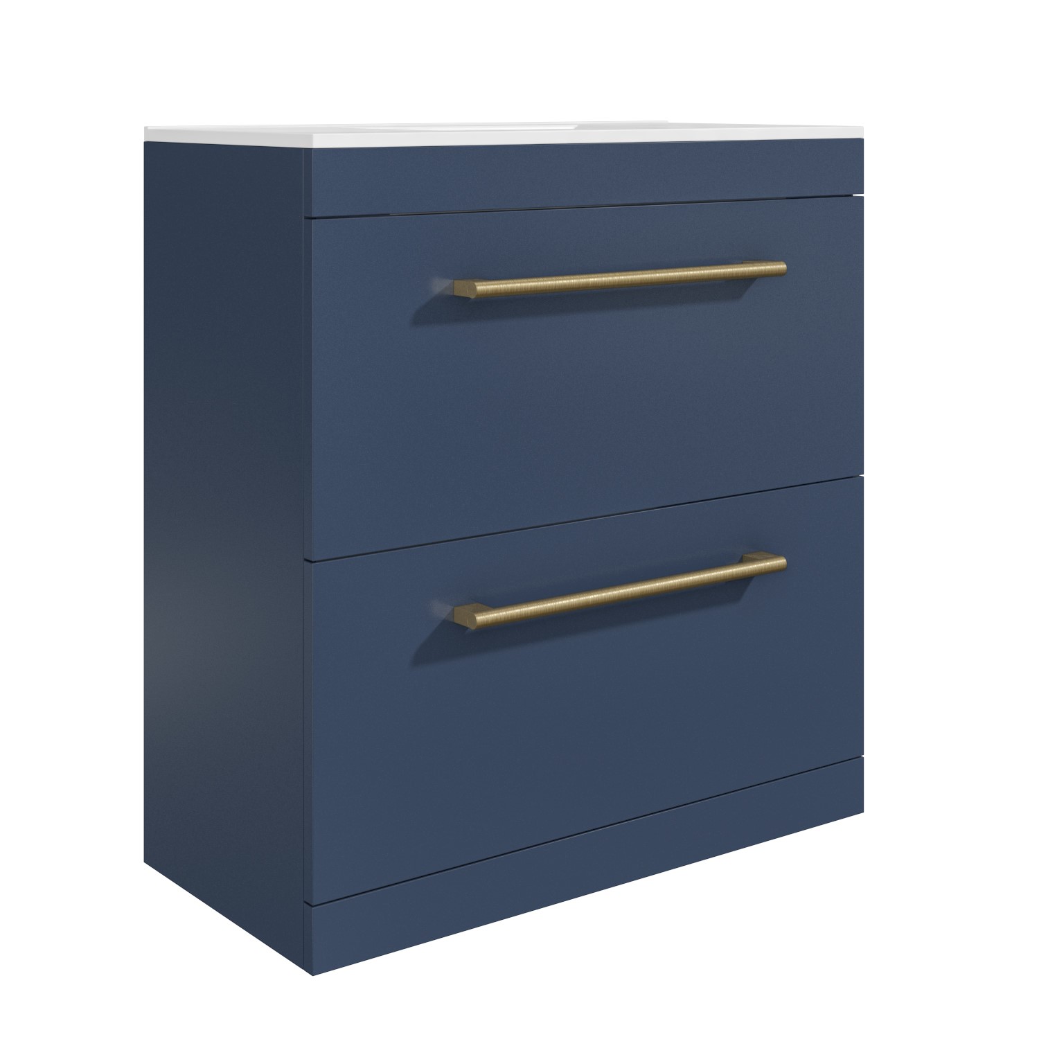 Update your bathroom with this modern Ashford freestanding 800mm vanity unit, finished in a fresh matt blue. The vanity unit is equipped with brushed brass handles for easy opening which match the included overflow, and the the matt blue finish instantly refreshes your bathroom whilst being easy to maintain. Store your essentials with the ample storage space with a two spacious drawers which are equipped with soft-closing runners for quiet operation, making this the perfect fit for family bathrooms.