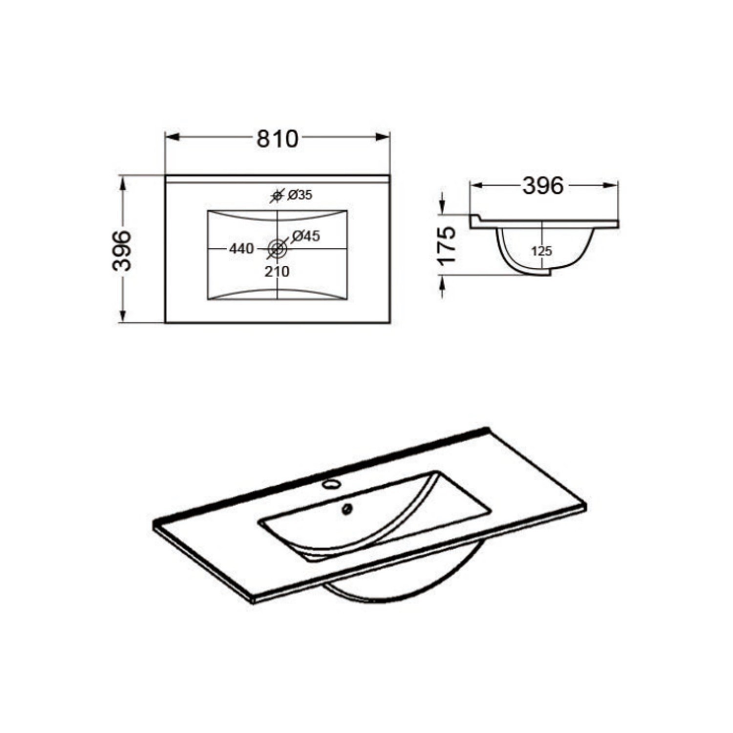 - Overall Basin Vanity Dimensions (including basin): H850mm x W810mm x D396mm