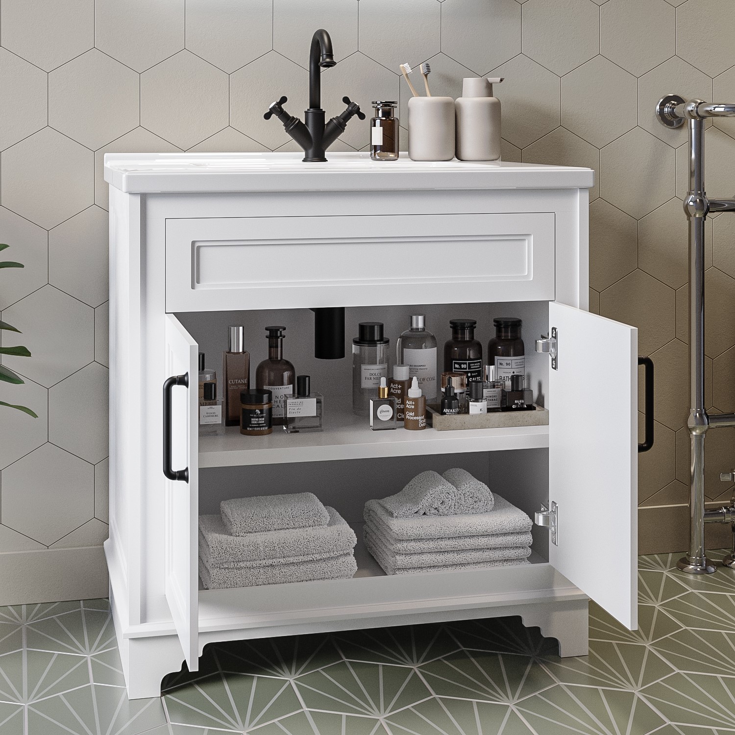 The black metal handles give the unit an industrial edge and open to reveal an interior shelf with room to store all your toiletries and other essentials. It even has soft closing hinges to prevent slamming and unnecessary damage. The unit requires no assembly, secure the basin then install your chosen tap, and you’re free to use it right away. Why not check out the rest of the Camden range to complete the look.