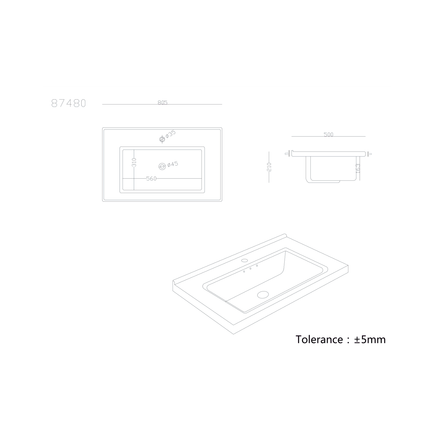 - Basin dimensions: H210 x W810 x D500 mm