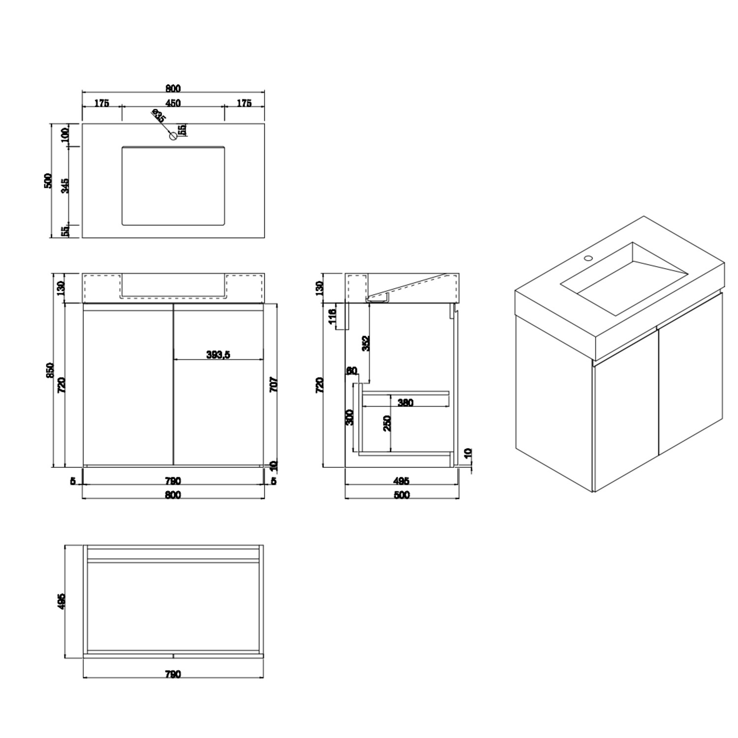- Overall Basin Vanity Dimensions (including basin): H850 x W800 x D500 mm