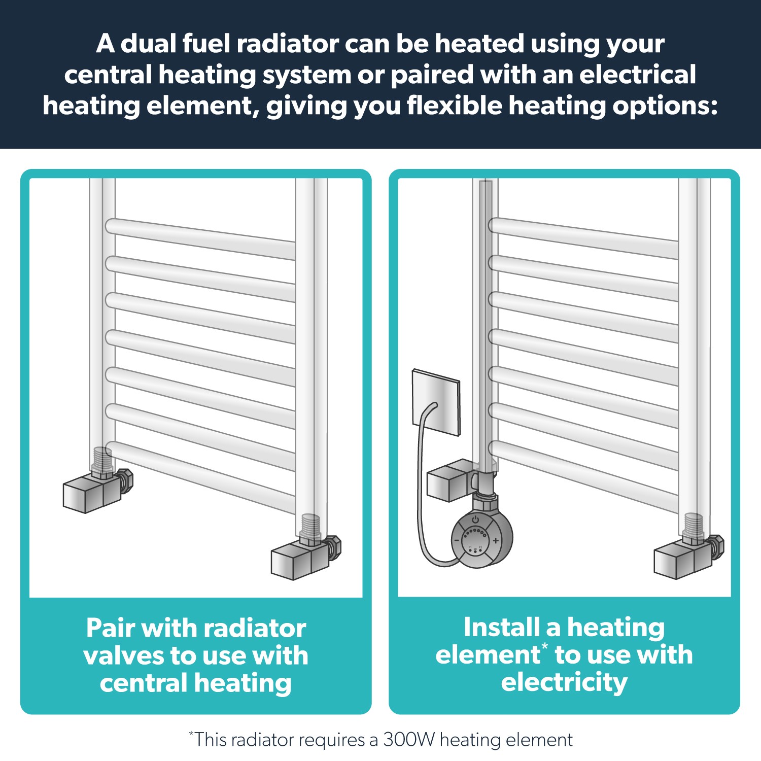 - Please note that a heating element must be purchased to make this towel rail dual fuel