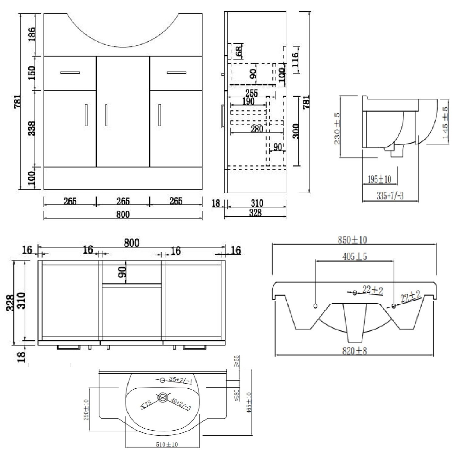 - Overall Basin Vanity Dimensions (including basin): H840 x W850 x D 470 mm (the vanity footprint is 800mm, however the basin overhang brings the total width to 850mm and depth to 470mm)