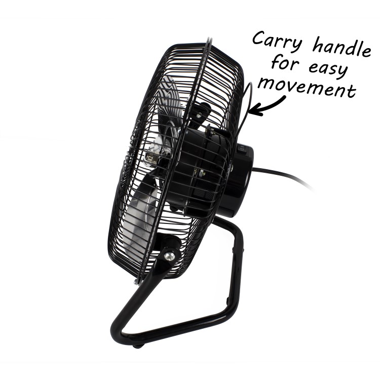 This 9 inch high velocity fan is perfect for keeping you cool on those long hot summer days. It features a classic grille and blade design, made from a lightweight yet stable metal construction that can be rotated 180° up and down to suit you. For added peace of mind, its fitted with a mesh safety grill to help protect the blades and prevent little wandering fingers from touching the fan. Plus, the base of the fan includes a set of non-slip rubber feet to keep it steady on flat surfaces. The fan measures roughly the same height as a 2L bottle of water and narrow enough to sit on a windowsill, so you can have it blow fresh air from outside if it gets stuffy indoors. The fan offers two speed settings, a gentle breeze on low and a cooling wind on high, both of which are powerful enough to keep you feeling refreshed but quiet enough not to disrupt you - perfect for using at night time.