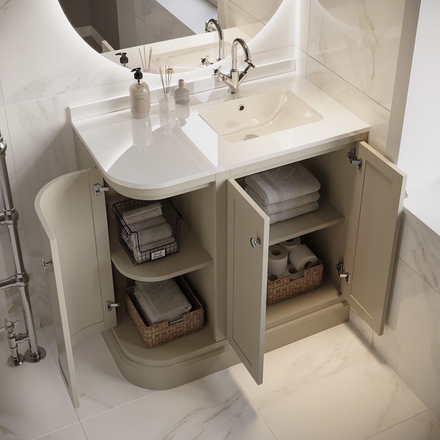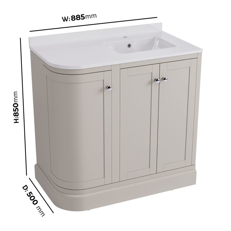 Transform your bathroom into a refined sanctuary with the Bowland 885mm curved freestanding corner vanity unit. Finished in a stunning matt beige, this vanity is inspired by timeless traditional elegance, this beautifully contoured design combines soft curves with a flawless finish, creating a statement piece that exudes sophistication. Designed for bathrooms where space is at a premium but style can’t be compromised, this vanity unit combines classic charm with modern functionality. Its curved front and beige finish give it a refined, traditional look that suits a range of interior styles. The inset basin is positioned on the right-hand corner, making it a smart choice for bathrooms with specific layout needs. Whether installed beside a doorway or in a tighter corner, this corner vanity unit helps make the most of your floor plan. The doors open wide for easy access and storage, making cleaning inside effortless. They also feature soft closing hinges to prevent slamming and accidental damage.