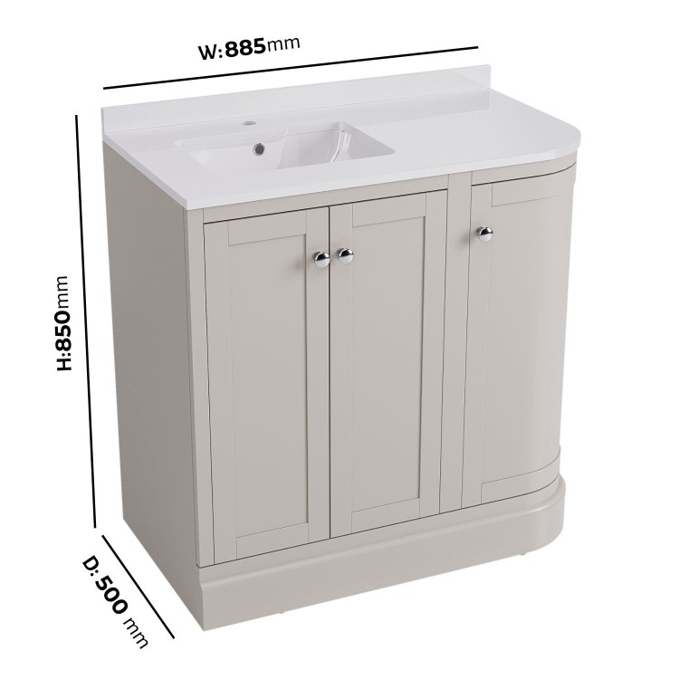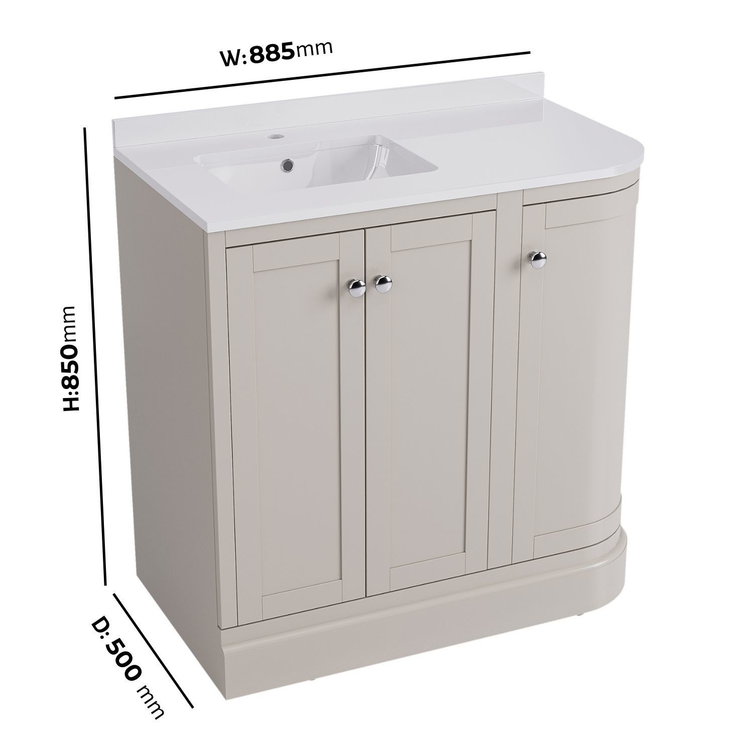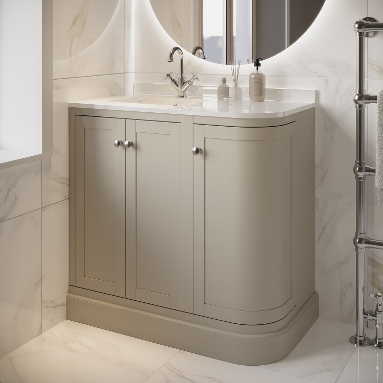 Transform your bathroom into a refined sanctuary with the Bowland 885mm curved freestanding corner vanity unit. Finished in a stunning matt beige, this vanity is inspired by timeless traditional elegance, this beautifully contoured design combines soft curves with a flawless finish, creating a statement piece that exudes sophistication. Designed for bathrooms where space is at a premium but style can’t be compromised, this vanity unit combines classic charm with modern functionality. Its curved front and beige finish give it a refined, traditional look that suits a range of interior styles. The inset basin is positioned on the left-hand corner, making it a smart choice for bathrooms with specific layout needs. Whether installed beside a doorway or in a tighter corner, this corner vanity unit helps make the most of your floor plan. The doors open wide for easy access and storage, making cleaning inside effortless. They also feature soft closing hinges to prevent slamming and accidental damage.