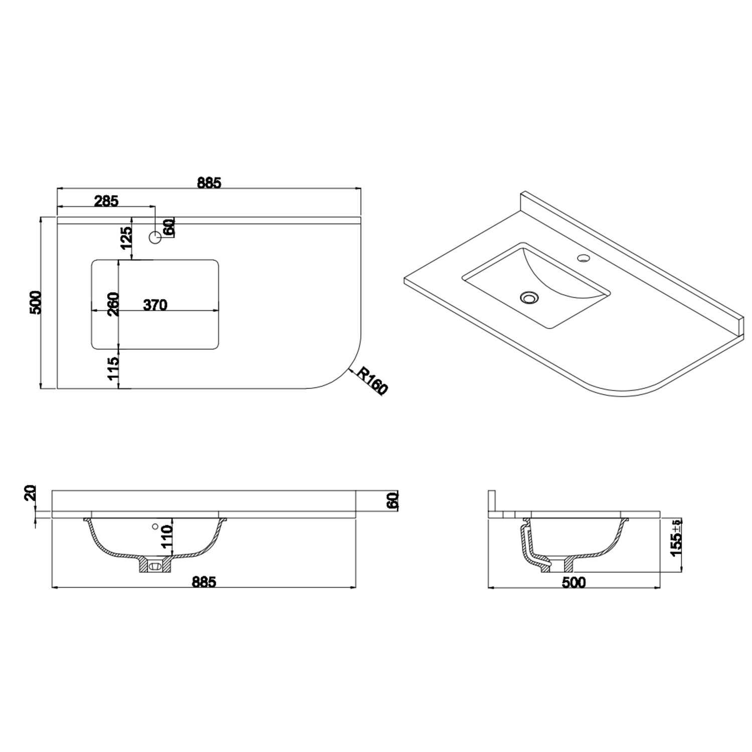 - Overall Basin Vanity Dimensions (including basin): H870 x W885 x D500mm