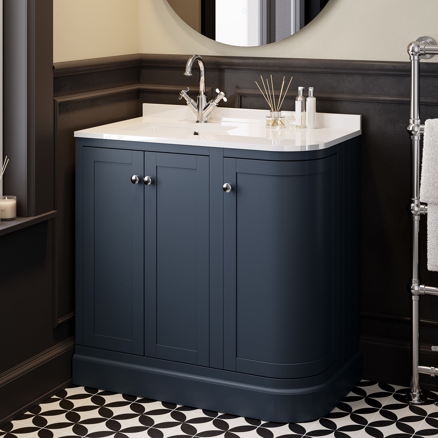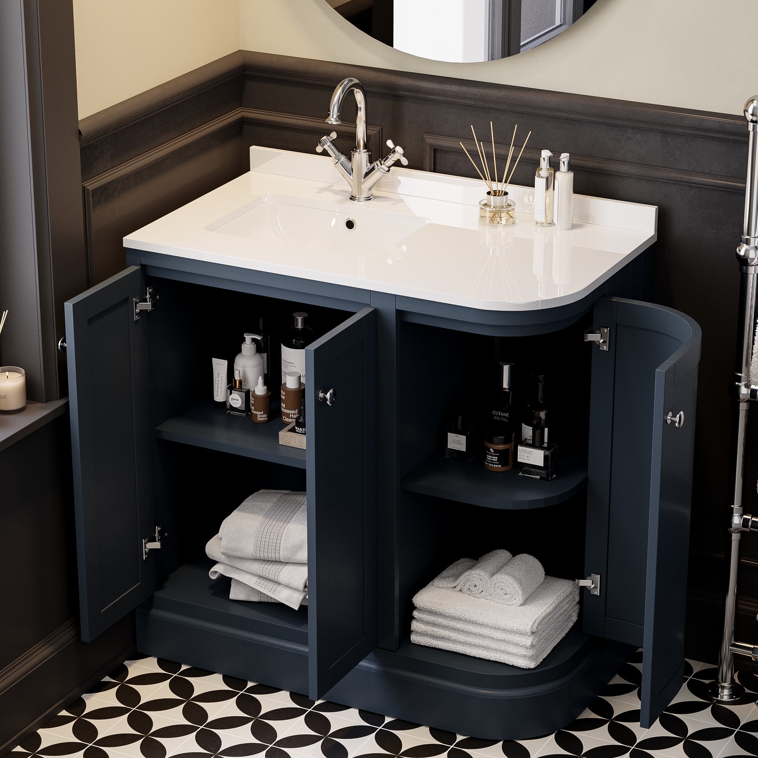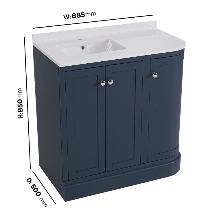 Transform your bathroom into a refined sanctuary with the Bowland 885mm curved freestanding corner vanity unit. Finished in a stunning indigo blue, this vanity is inspired by timeless traditional elegance, this beautifully contoured design combines soft curves with a flawless finish, creating a statement piece that exudes sophistication. Designed for bathrooms where space is at a premium but style can’t be compromised, this vanity unit combines classic charm with modern functionality. Its curved front and indigo blue finish give it a refined, traditional look that suits a range of interior styles. The inset basin is positioned on the left-hand corner, making it a smart choice for bathrooms with specific layout needs. Whether installed beside a doorway or in a tighter corner, this corner vanity unit helps make the most of your floor plan. The doors open wide for easy access and storage, making cleaning inside effortless. They also feature soft closing hinges to prevent slamming and accidental damage.