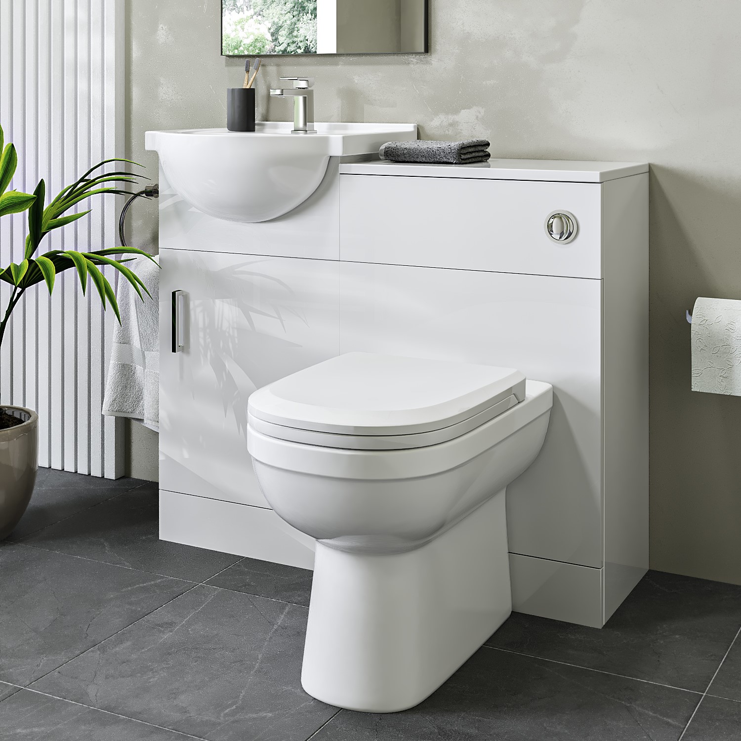 Behind the soft-close door, you’ll find two practical storage compartments to keep your toiletries or cleaning products tidy and accessible. The semi recessed ceramic basin is durable, easy to clean, with a predrilled tap hole for you to add a chrome cloakroom mono basin mixer tap of your choice. Alongside the vanity Included is a round back-to-wall toilet paired with a soft-close seat for added comfort and quieter use. The toilets ceramic construction allows for long lasting durability to everyday wear and tear whilst the gloss white finish allows for easy cleaning.