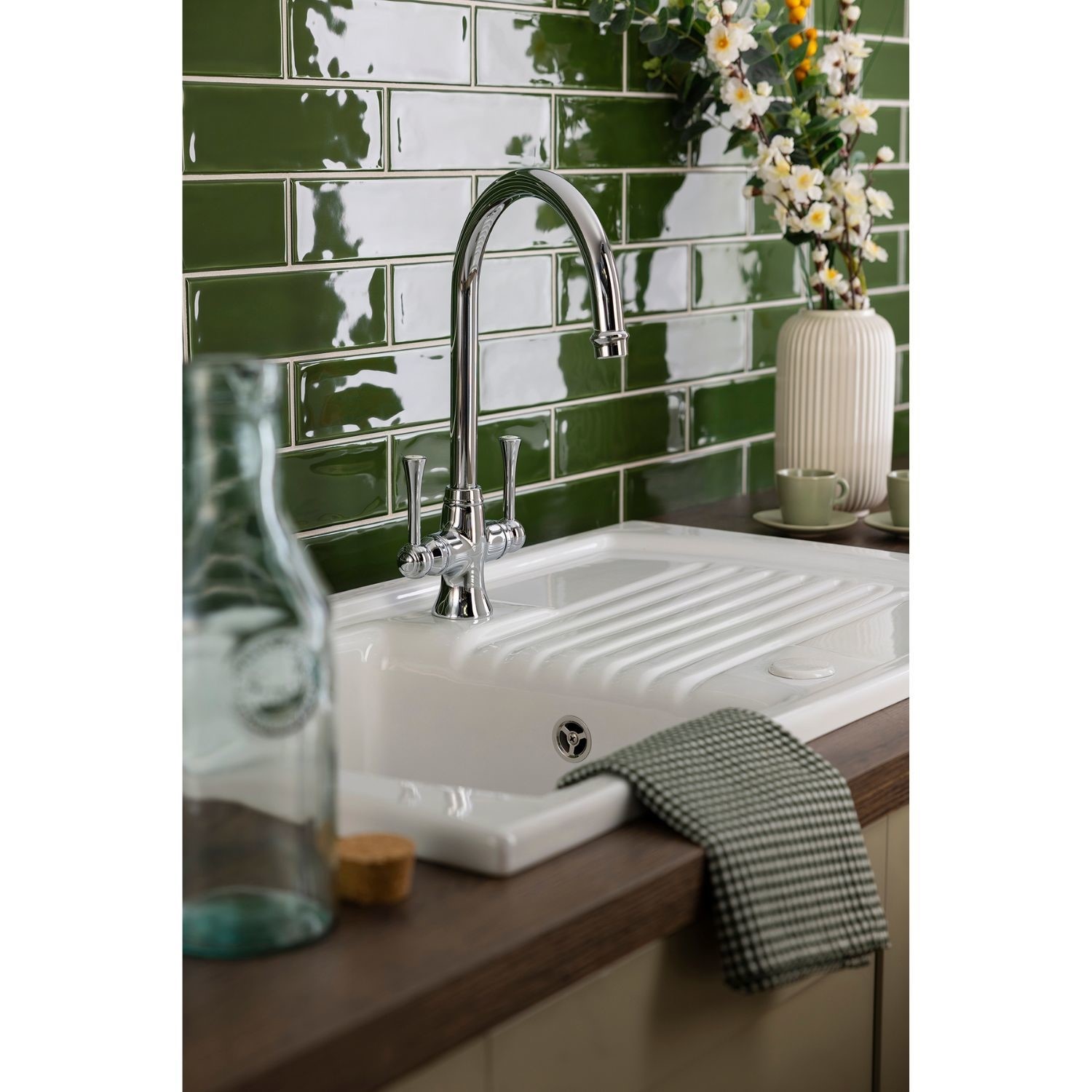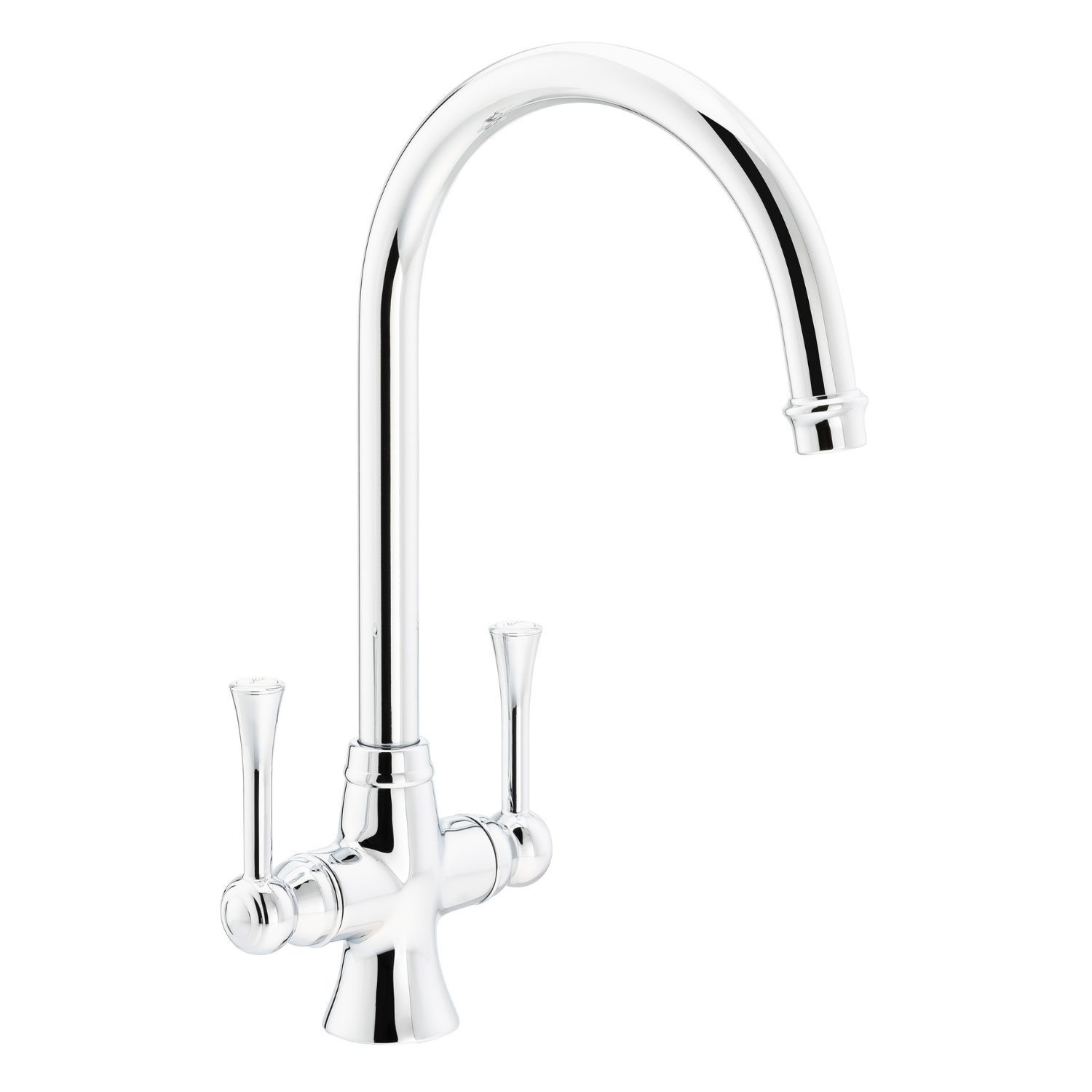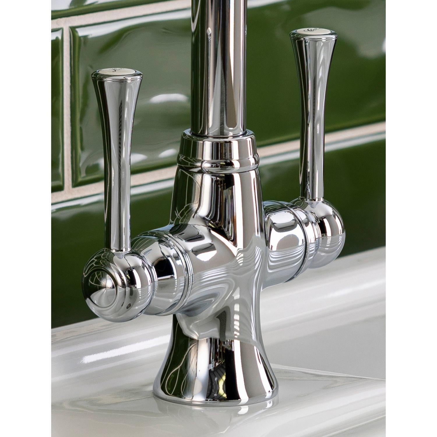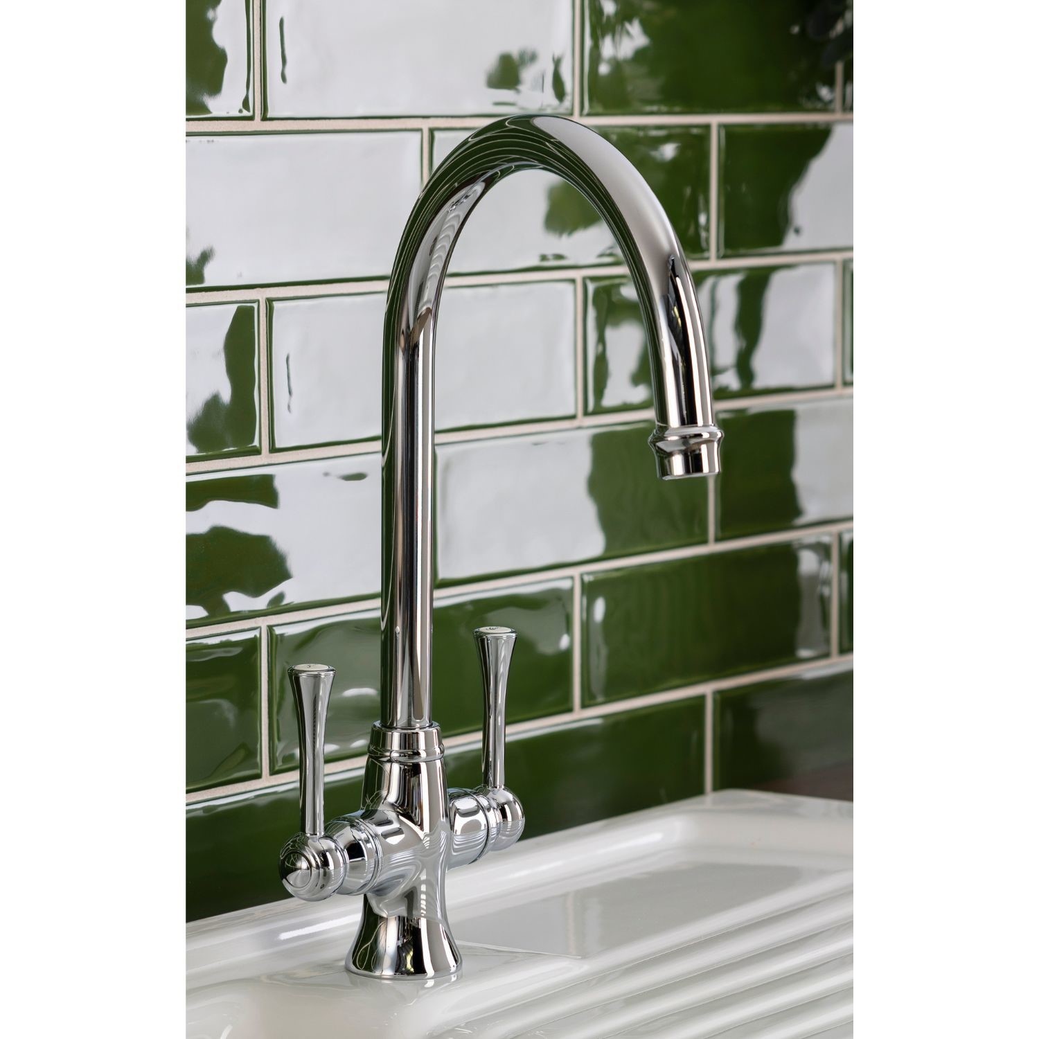 The Abode Gatsby Dual Lever Mixer Tap in Chrome brings sweeping curves and classic character to any traditional kitchen space. Designed and manufactured in Italy, this eye-catching tap features a tapered body, curved spout, and quarter turn lever handles for precision and ease of use. Ideal for lower to mid-pressure systems, it includes an antisplash spout and flexible tail pipes for quick installation. Finished in a polished chrome galvanic coating and made from solid brass, the Gatsby offers timeless style with modern functionality.