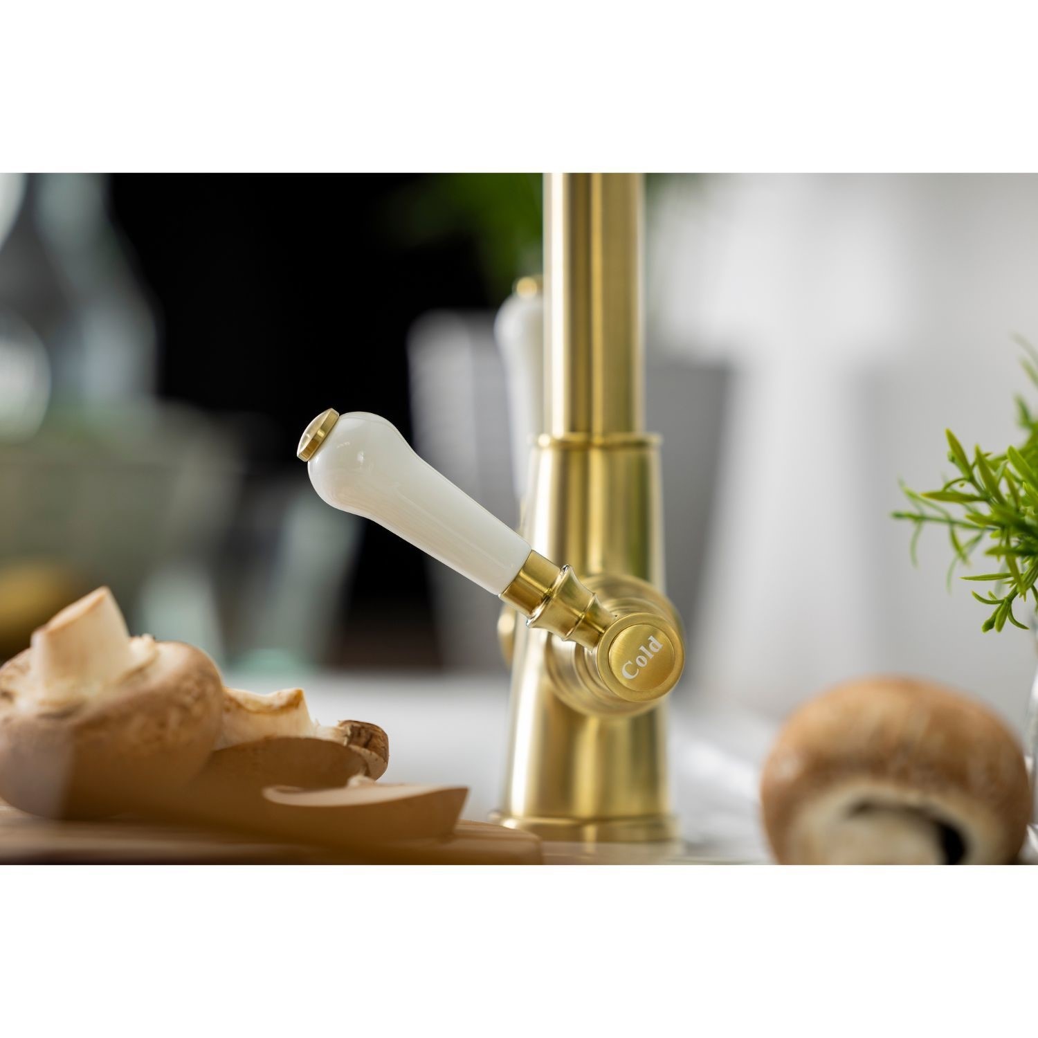 The Abode Keswick Dual Lever Mixer Tap in Brushed Brass is a perfect blend of traditional form and modern function. Featuring a sculpted body, white lever handles, and a sweeping swan neck spout, this deck-mounted tap is ideal for classic and heritage-style kitchens. The brushed brass galvanic finish adds a warm, luxurious tone, while 1/4 turn ceramic disc valves ensure smooth, reliable operation. Built from solid brass with a replaceable aerator, this tap is crafted for everyday performance and timeless appeal.