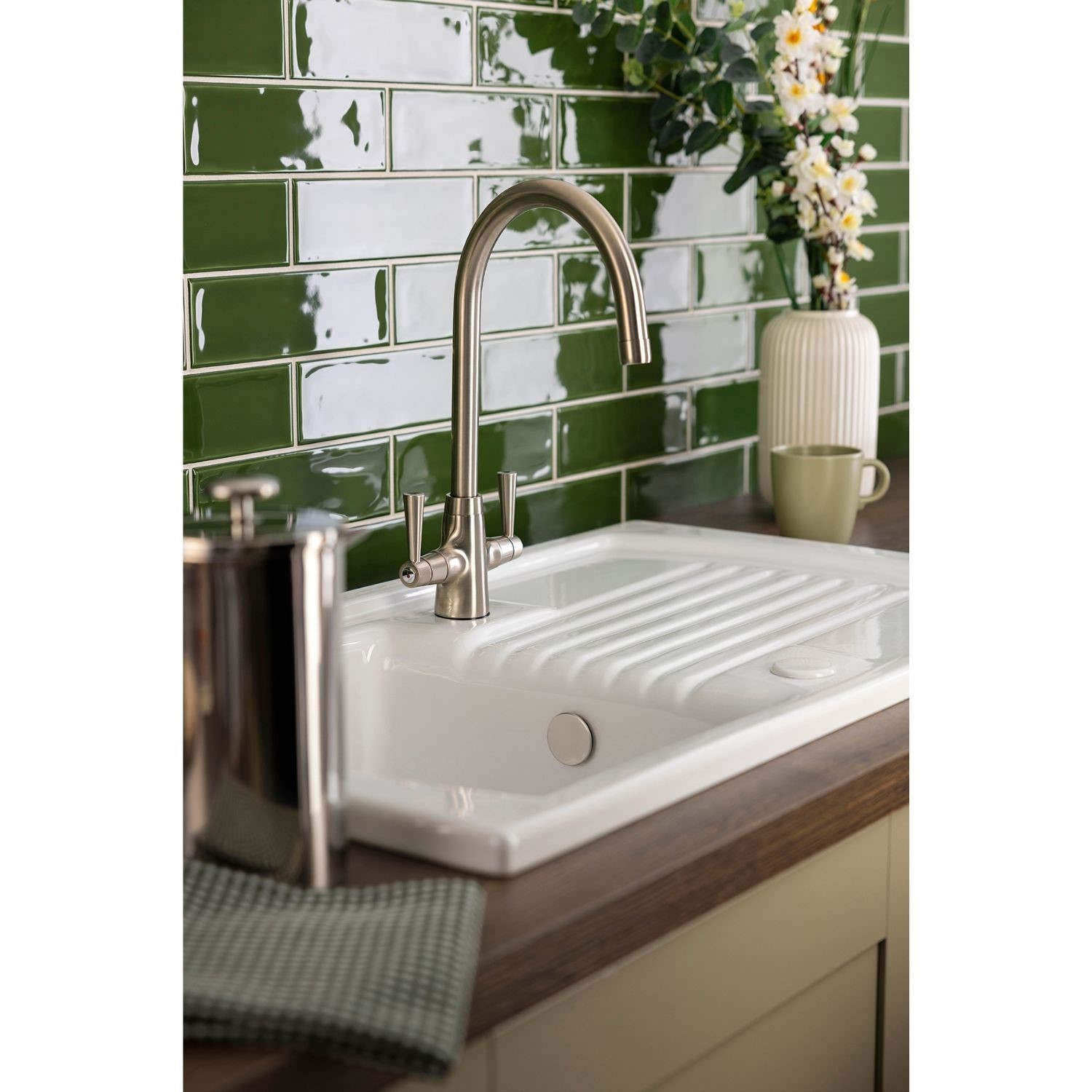 The Abode Stamford Dual Lever Mixer Tap in Brushed Nickel offers a timeless statement through subtle, elegant design. Its sculpted handles and gently tapered body create a balanced and sophisticated silhouette, perfect for both traditional and modern kitchens. Built from durable brass with a brushed nickel galvanic finish, it combines quality craftsmanship with enduring style. Ideal for all pressure systems, this tap features smooth 1/4 turn ceramic disc operation and a replaceable aerator for lasting functionality.