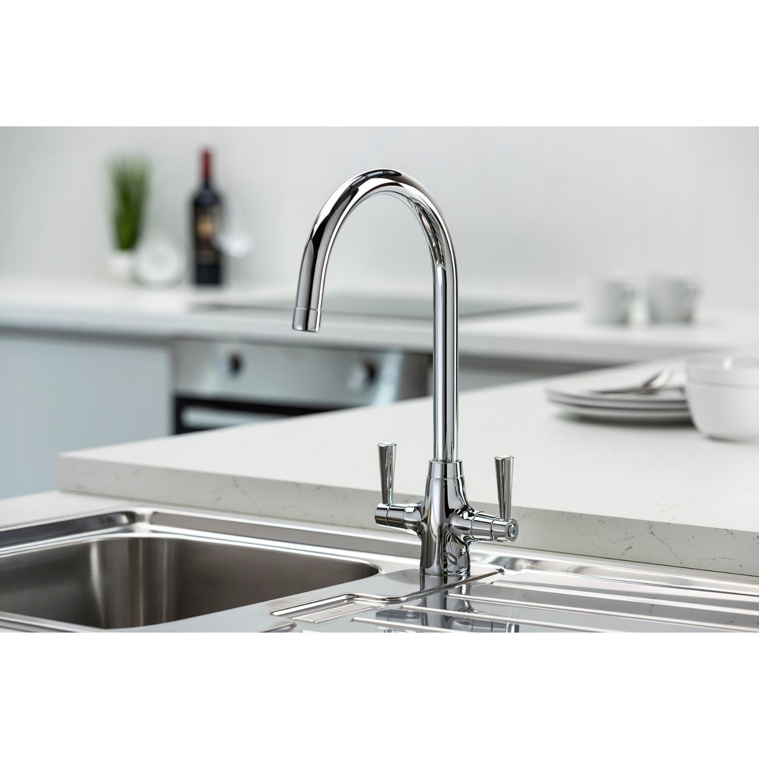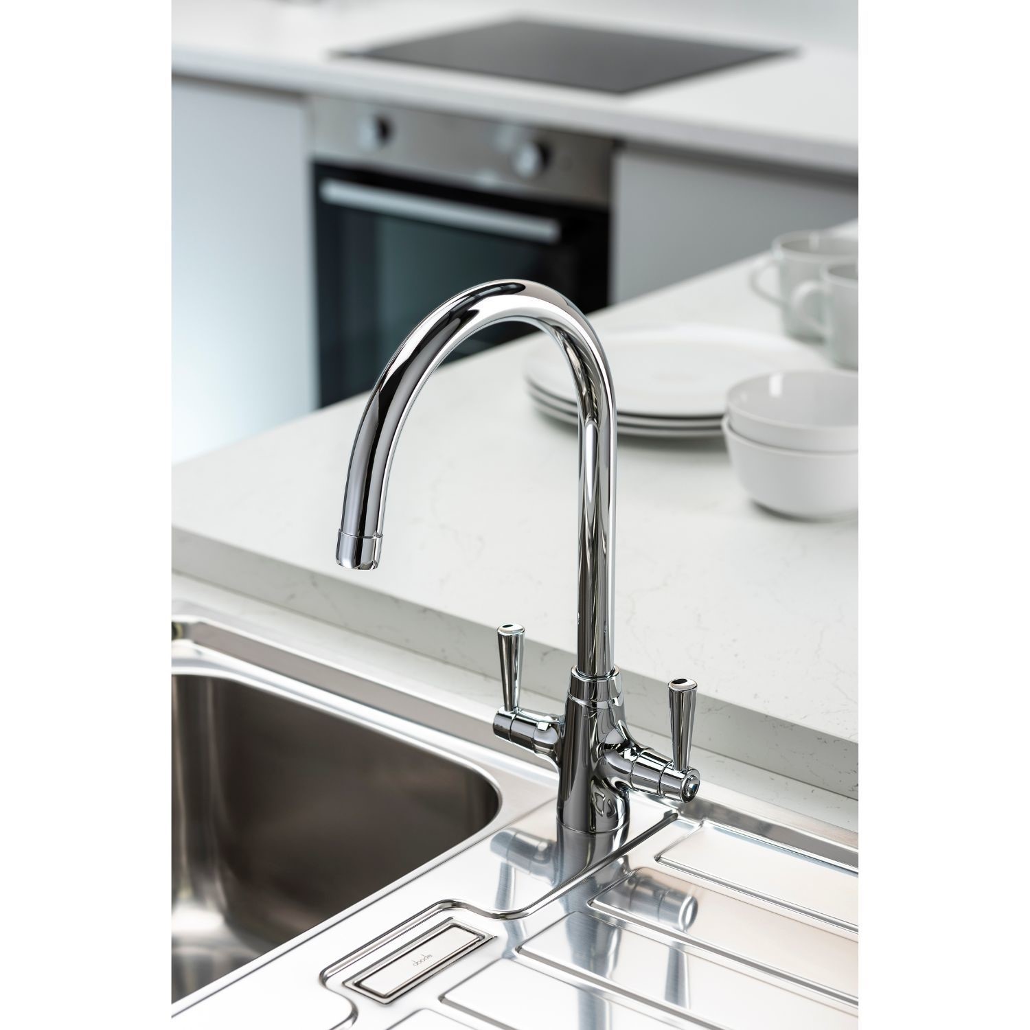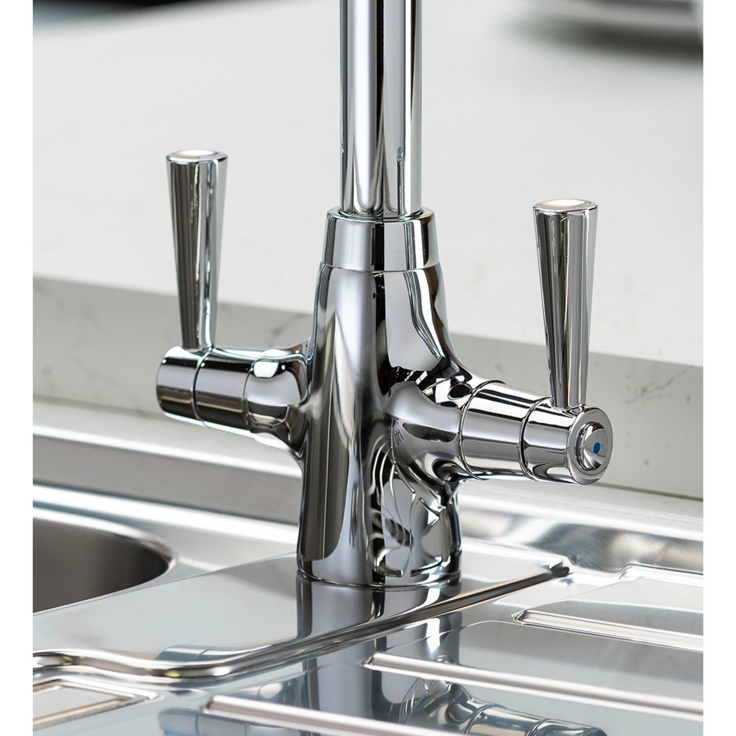 The Abode Stamford Dual Lever Mixer Tap in Chrome showcases refined, understated elegance with its gently tapered body and sculpted handles. This versatile tap complements both traditional and contemporary interiors, offering timeless design with modern engineering. Crafted from durable brass and finished in polished chrome, it delivers reliable performance with a smooth 1/4 turn ceramic valve operation, making it ideal for all pressure systems.