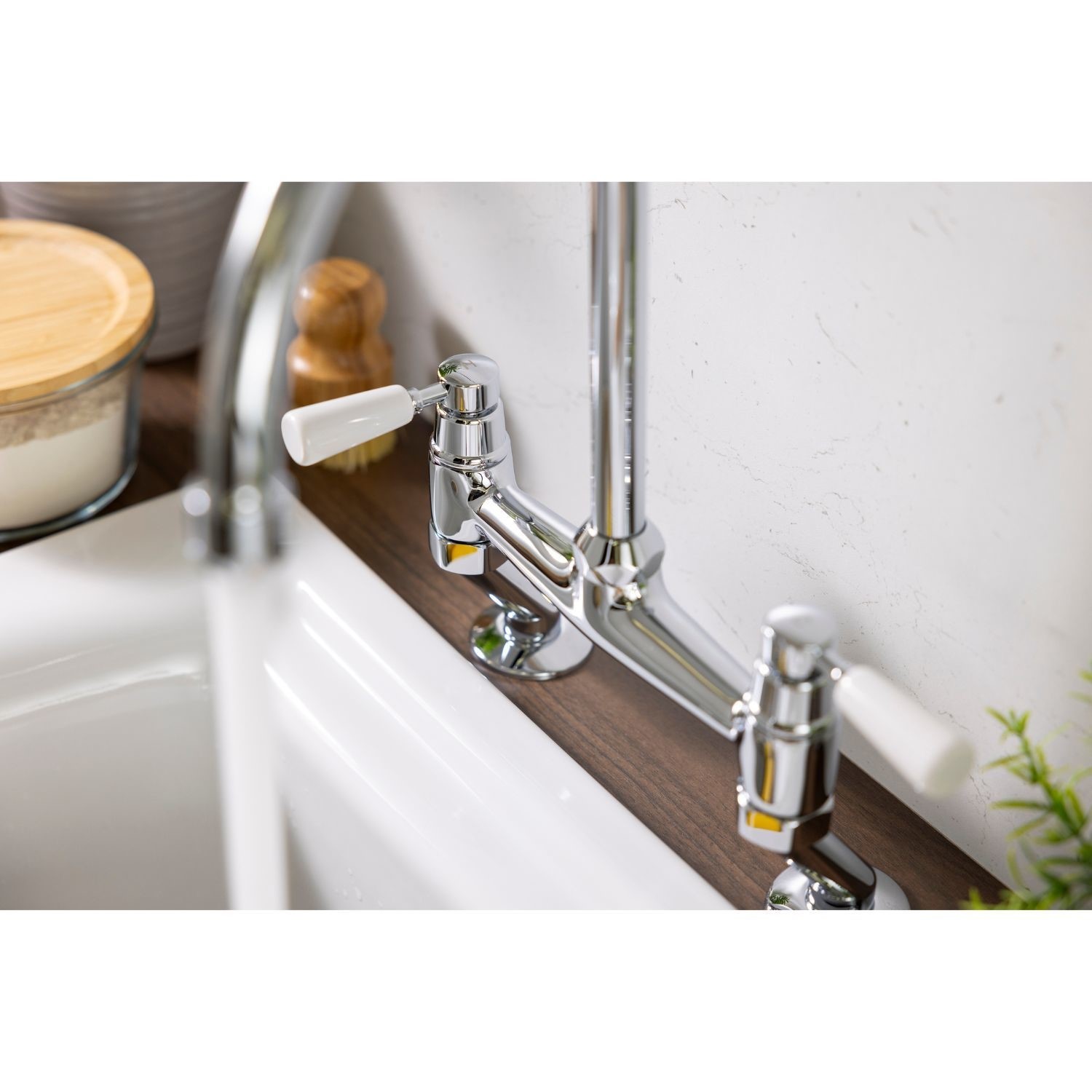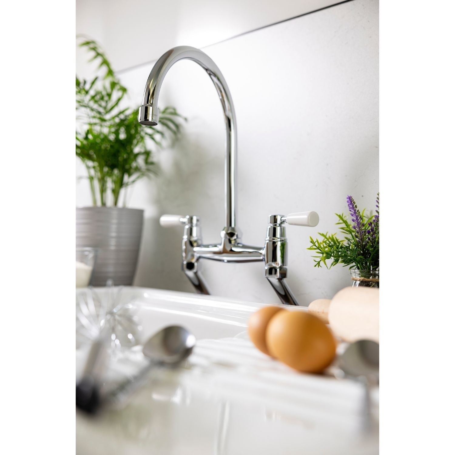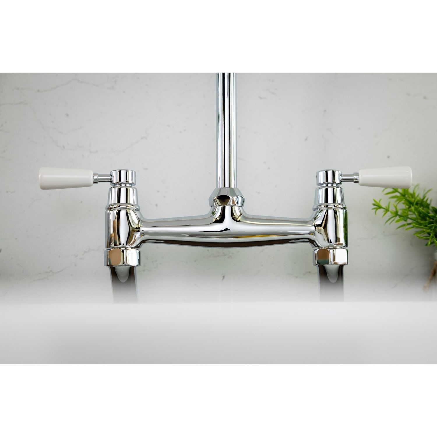 The Abode Traditional Bridge Dual Lever Mixer Tap in Chrome offers classic appeal with a timeless bridge design and elegant ceramic-style handles. Built with premium materials, it blends traditional aesthetics with modern engineering, delivering exceptional durability and effortless performance across all pressure systems.