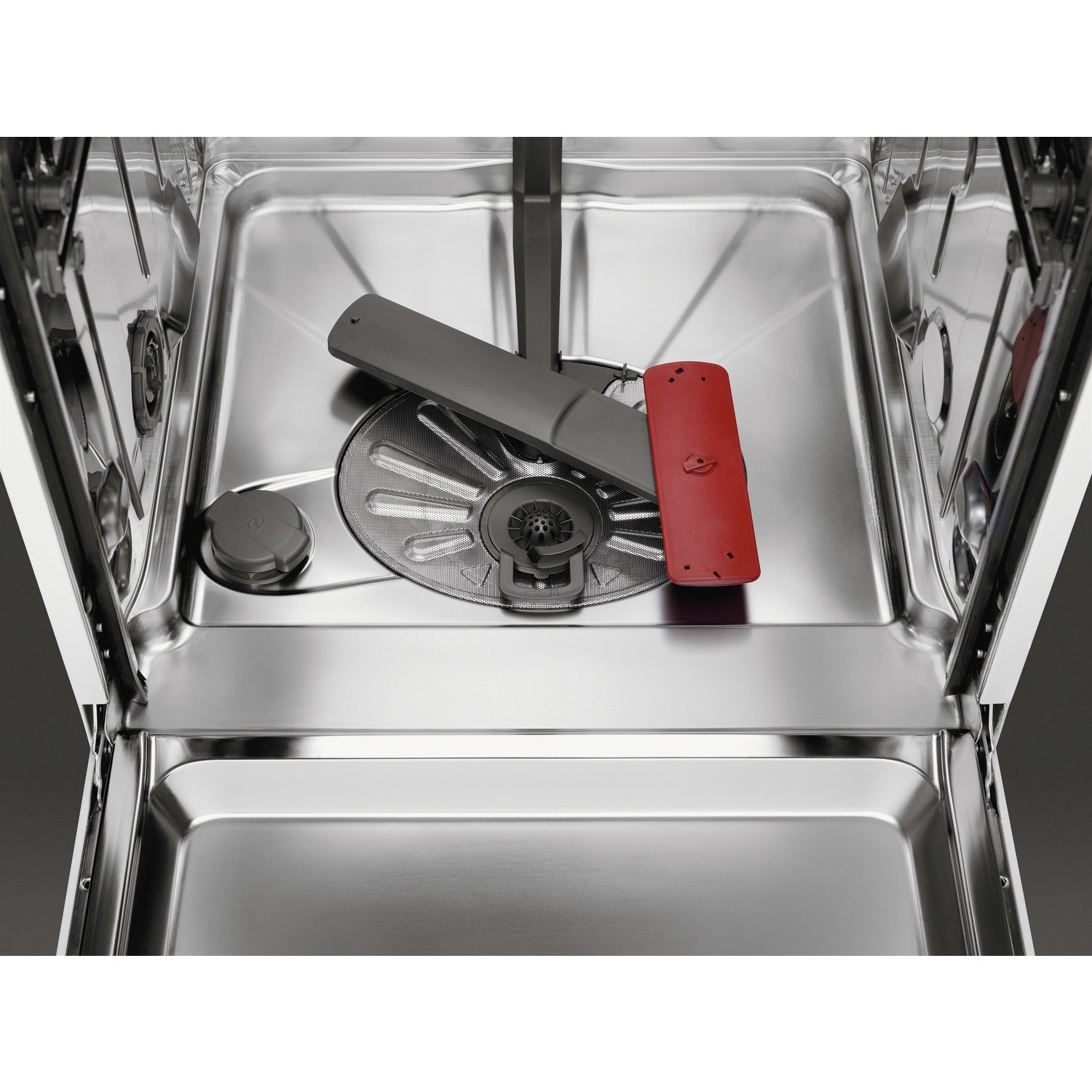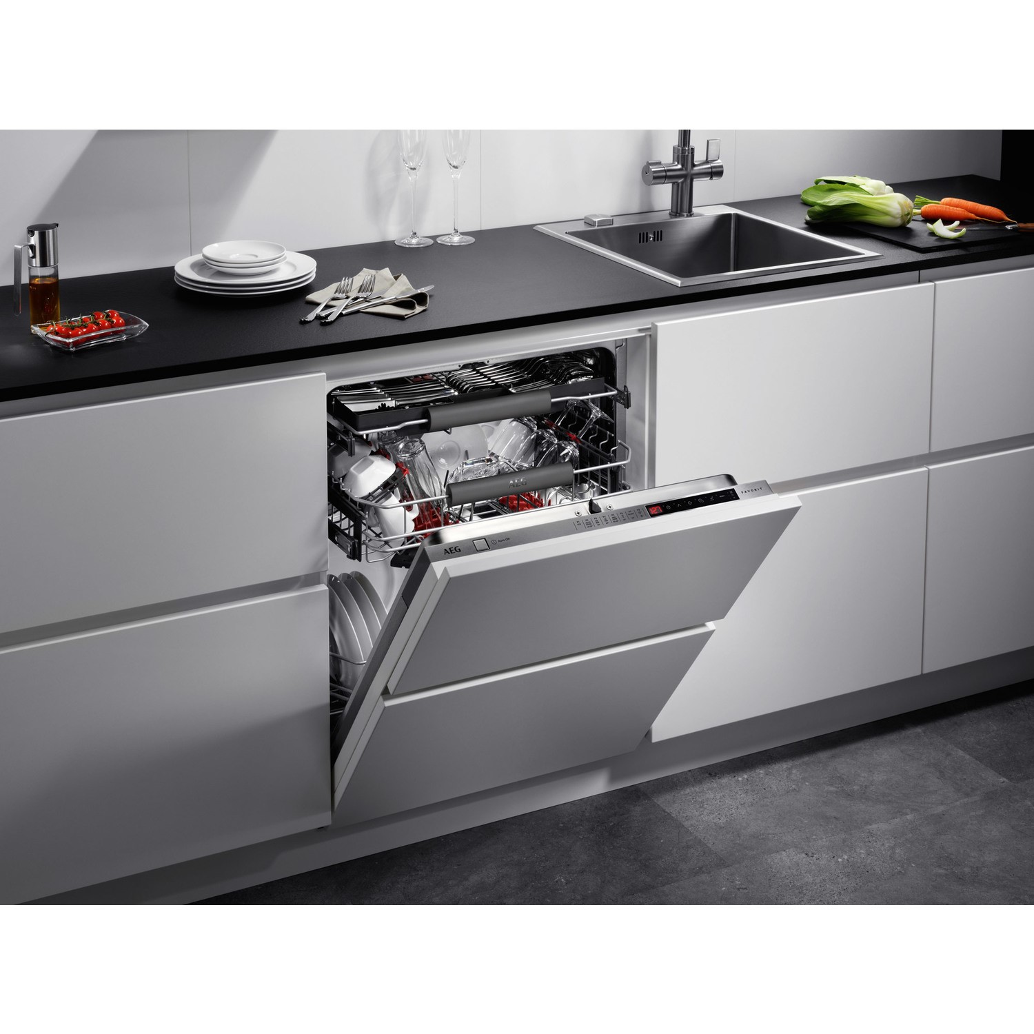 This AEG FSE83710P 15 Place Fully Integrated Dishwasher is ideal for saving washing time with the Time Saver Function that allows you to cut the length of your cycle in half to ensure your dishes will be ready for use when you need them again, ideal for when you're having guests. This advanced dishwasher allows for complete customisation of the internal compartments with Unique Foldable Racks and a Liftable Basket, meaning that all shapes and sizes are accomodated for. With Innovative Satellite Spray Arms every corner is thoroughly covered with water being sprayed to prevent residue and achieve stunning results across every surface. Additionally, cycles can be customised using AEG's Sensorlogic Technology which automatically ajusts the time, temperatures and water usage according to the soil level of each load, to provide you with the very best results every time.