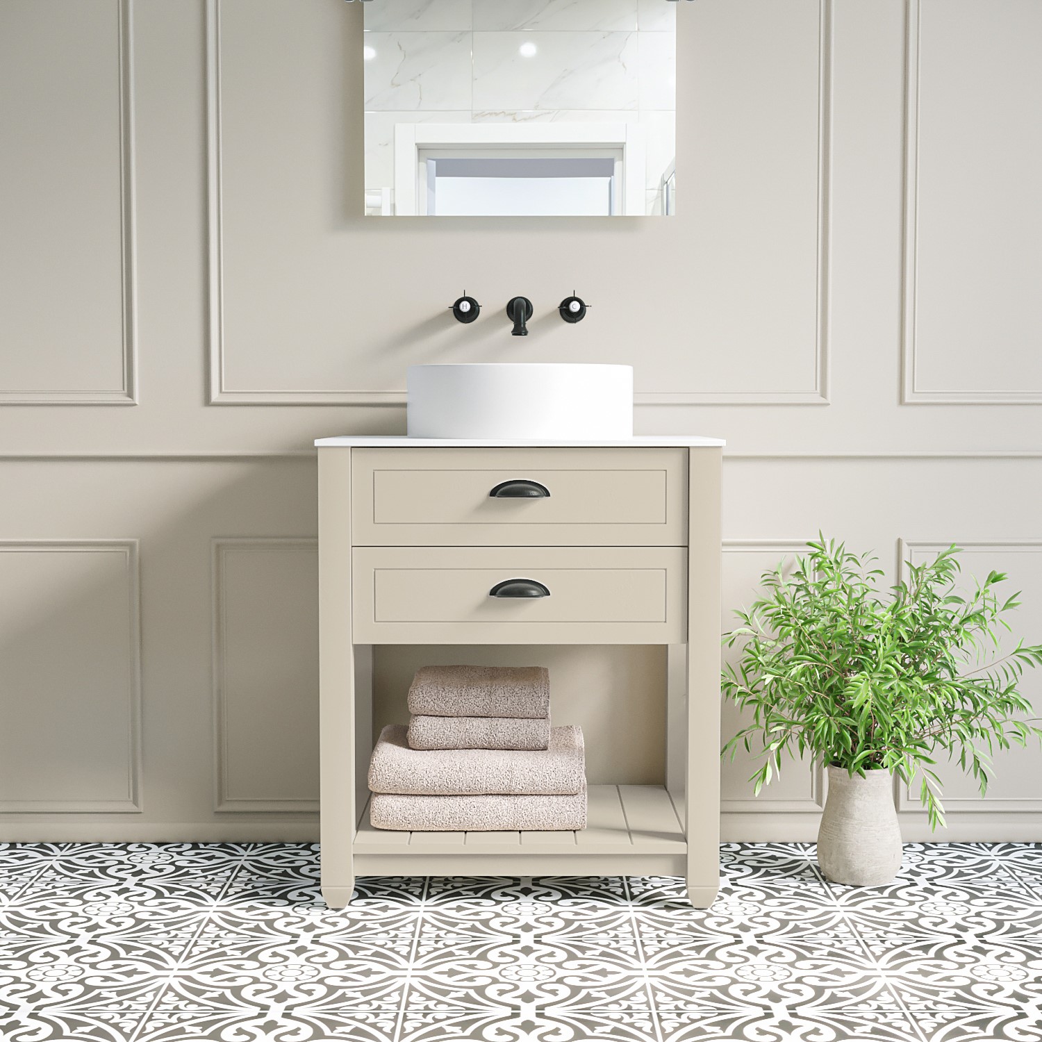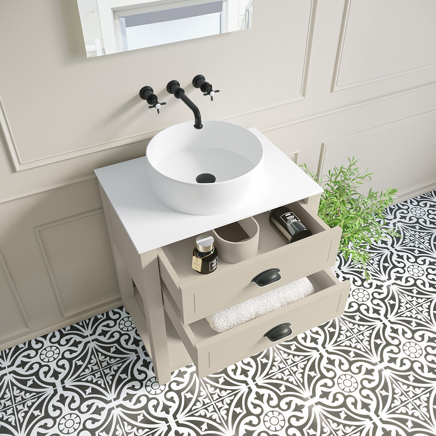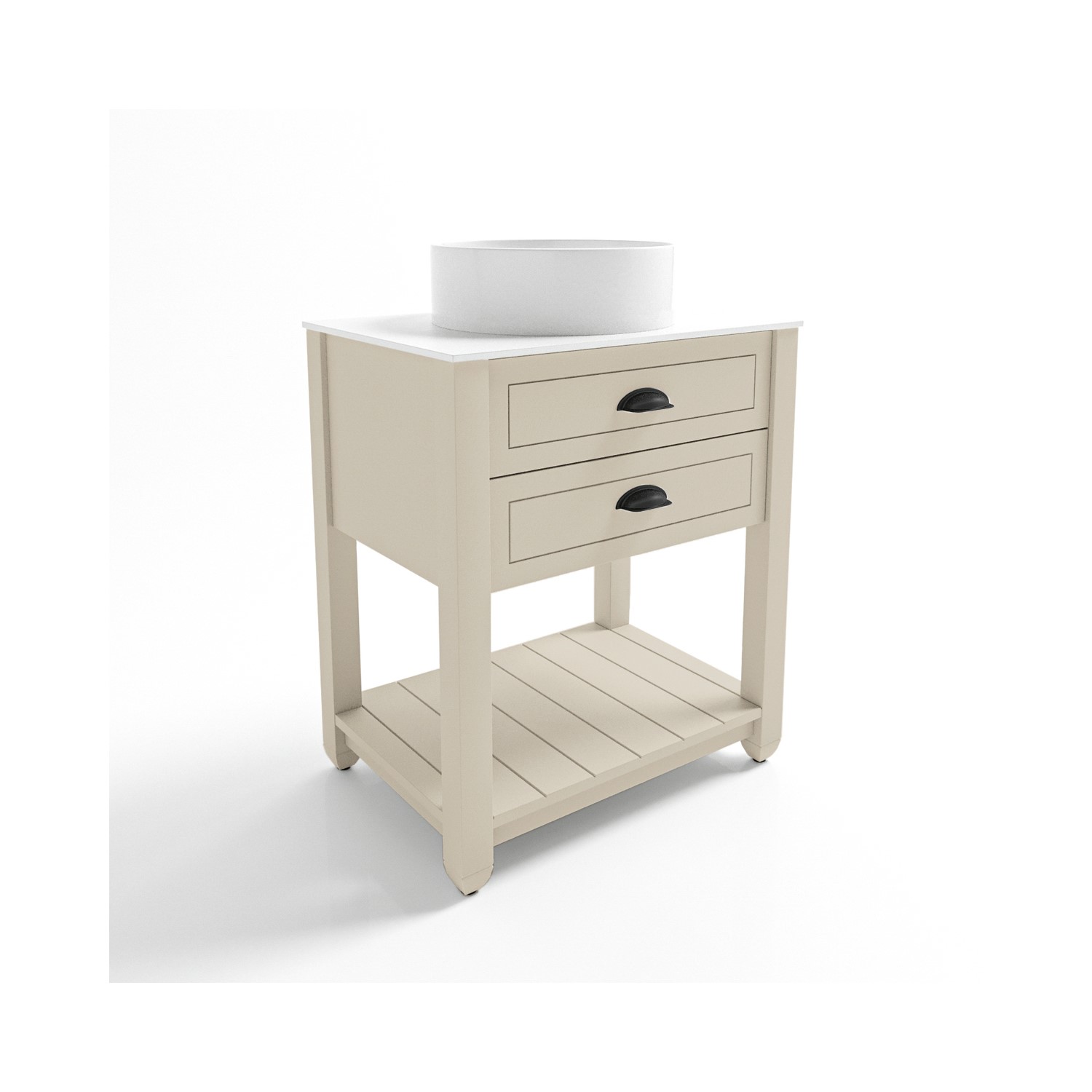 Give your bathroom an instant update with this freestanding vanity unit, which includes the round countertop basin. Its timeless design will update your bathroom and be the perfect centrepiece with its matt beige finish that harmonises beautifully with its solid surface matt white top, and black cup pull handles.
