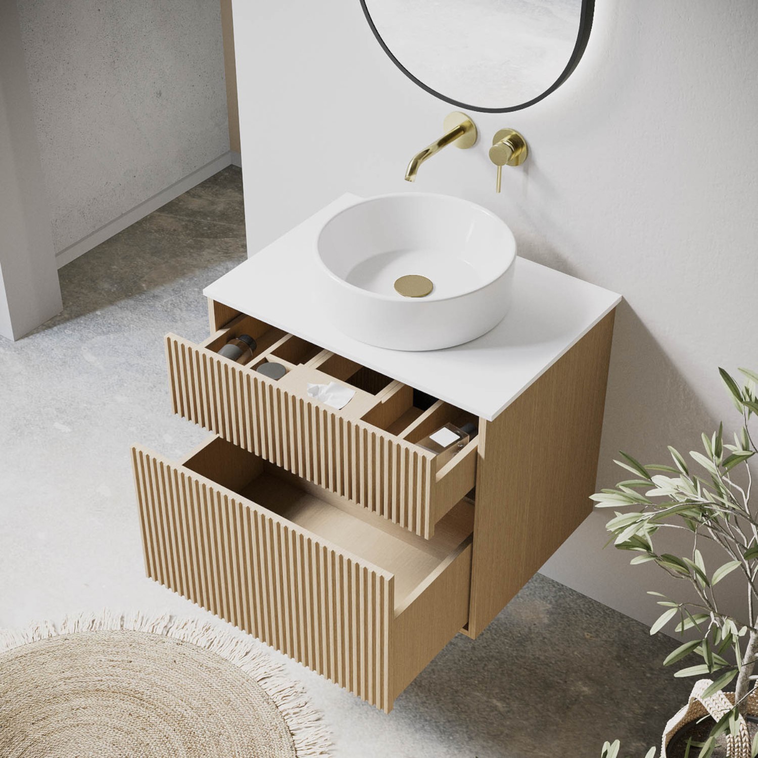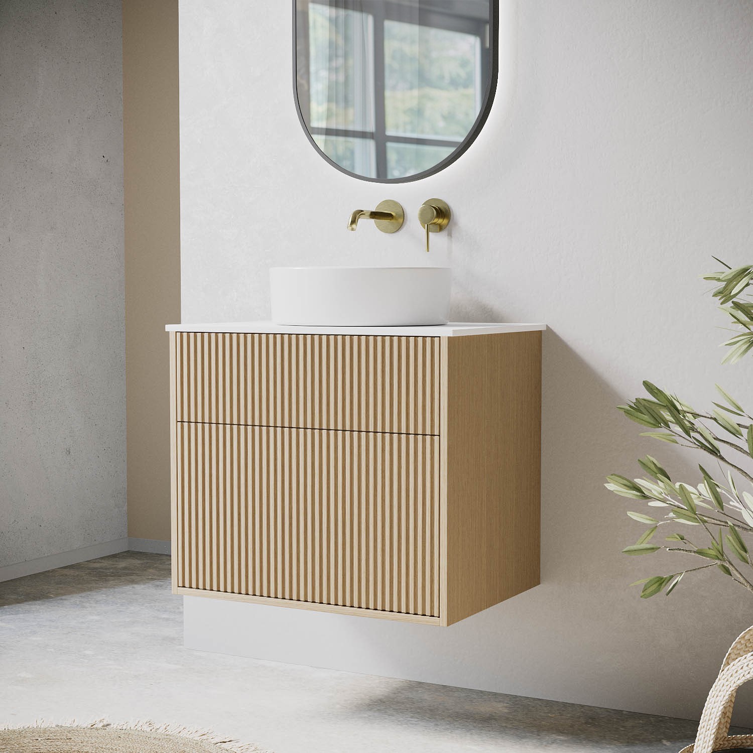 Upgrade your bathroom with our light wood fluted Matira 650mm wall hung vanity unit bringing a contemporary luxe style to your home. The floating vanity unit offers a space saving solution, opening up your floor space, whilst providing ample storage. The two deep fluted drawers with push to open and soft closing mechanisms add a premium touch to your bathroom.