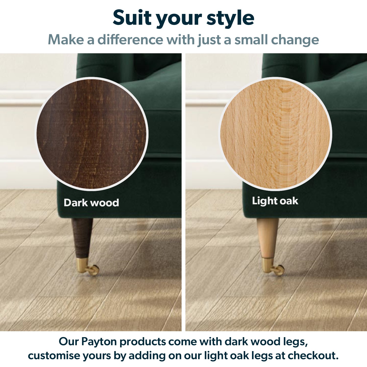 Create the ultimate cosy spot in your living room with our Payton velvet armchair. The modern silhouette makes it the perfect statement piece, and with stunning dark green velvet upholstery, it brings a touch of luxury to any space. The front legs feature castors so it’s easy to move around, and the back legs hold it in place. Check out our upholstery care kit to keep your armchair in tip-top condition.