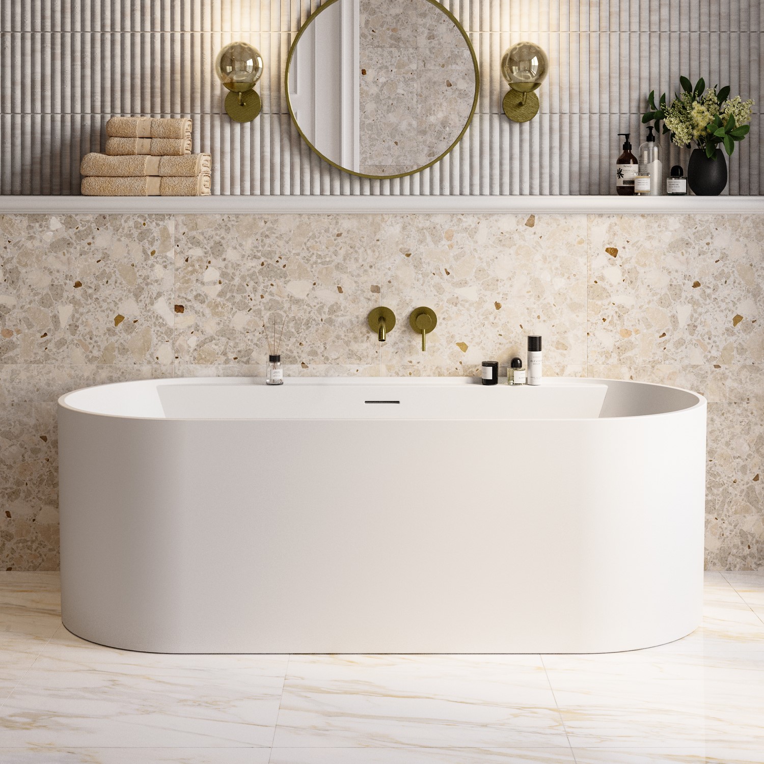 Freestanding Double Ended Design: Striking focal point with gentle slopes at both ends for comfortable bathing from either side, in a timeless oval shape with a sophisticated matt white finish that suits both modern and classic interiors.