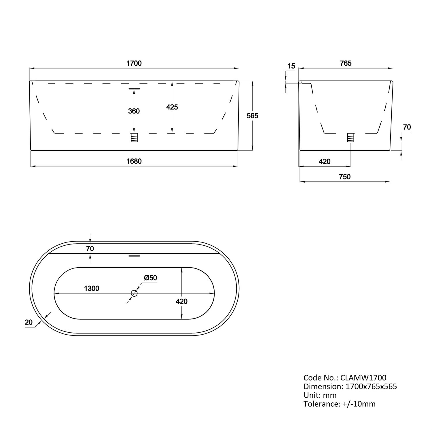 - Dimensions: L1700x H565 x W765 mm