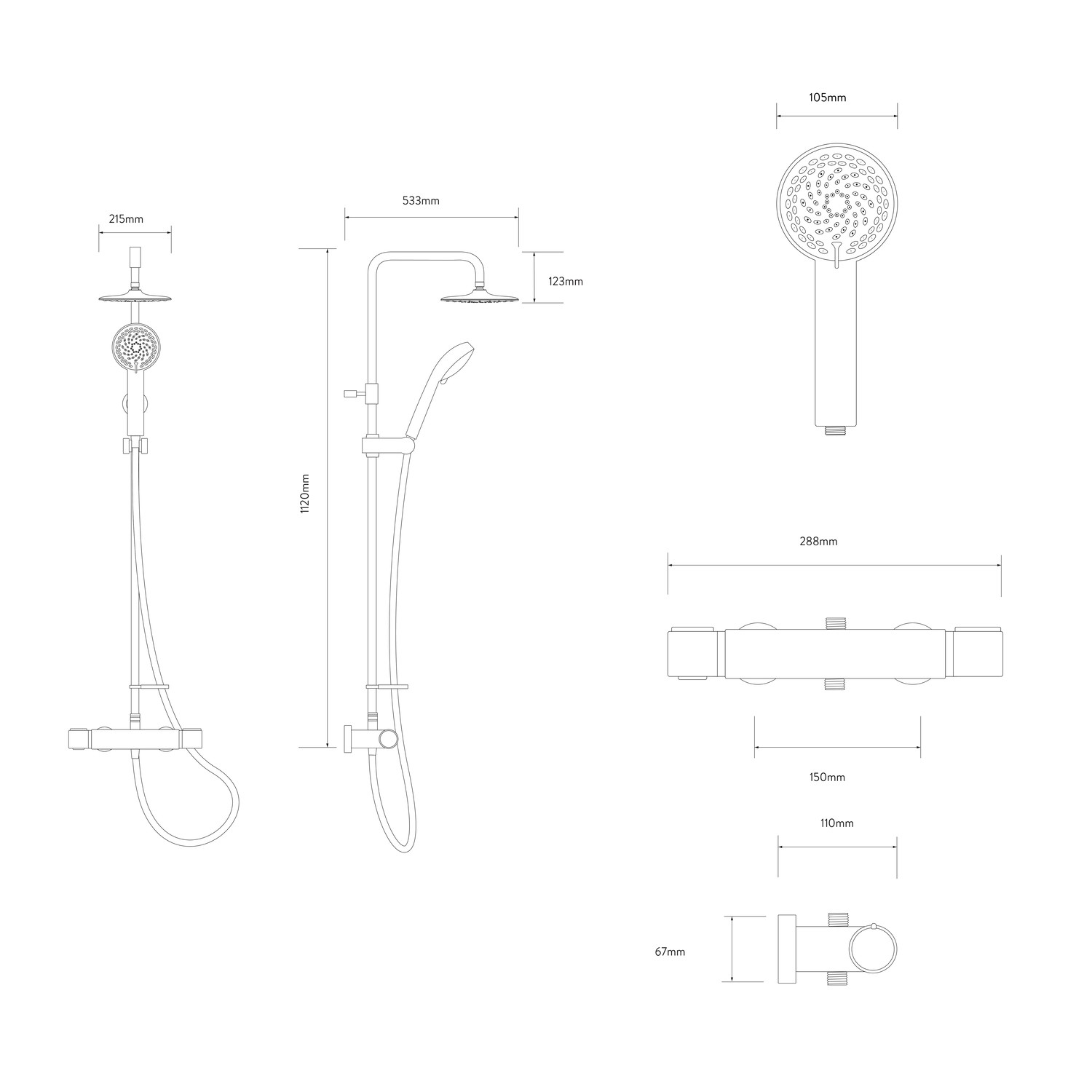 - Box contents: Bar valve, 105mm adjustable head, 215mm fixed head, 1120mm fixed riser rail, 1.5m hose, pinch grip slider, gel hanger, fixtures and fittings
