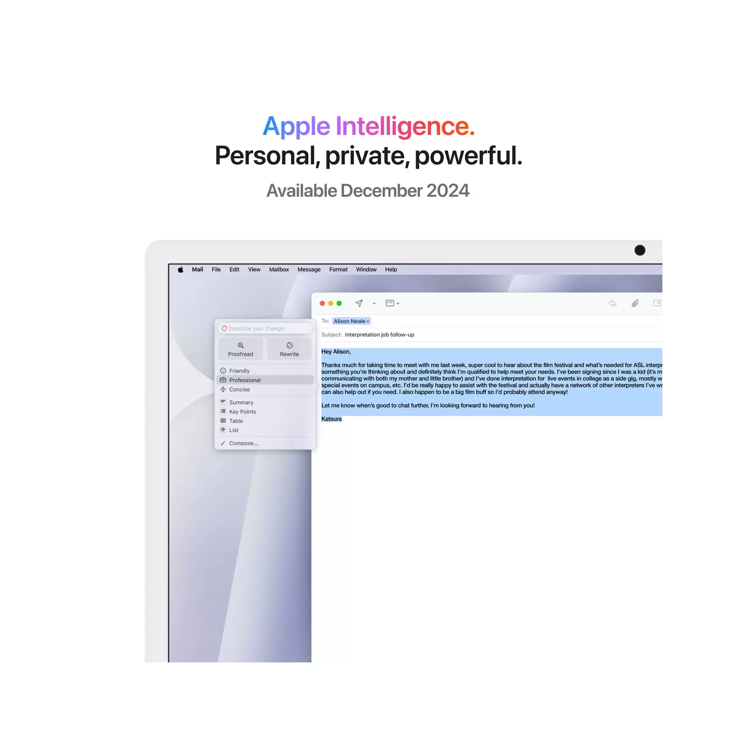 Apple Intelligence is the personal intelligence system that helps you write, express yourself and get things done effortlessly. With groundbreaking privacy protections, it gives you peace of mind that no one else can access your data - not even Apple.