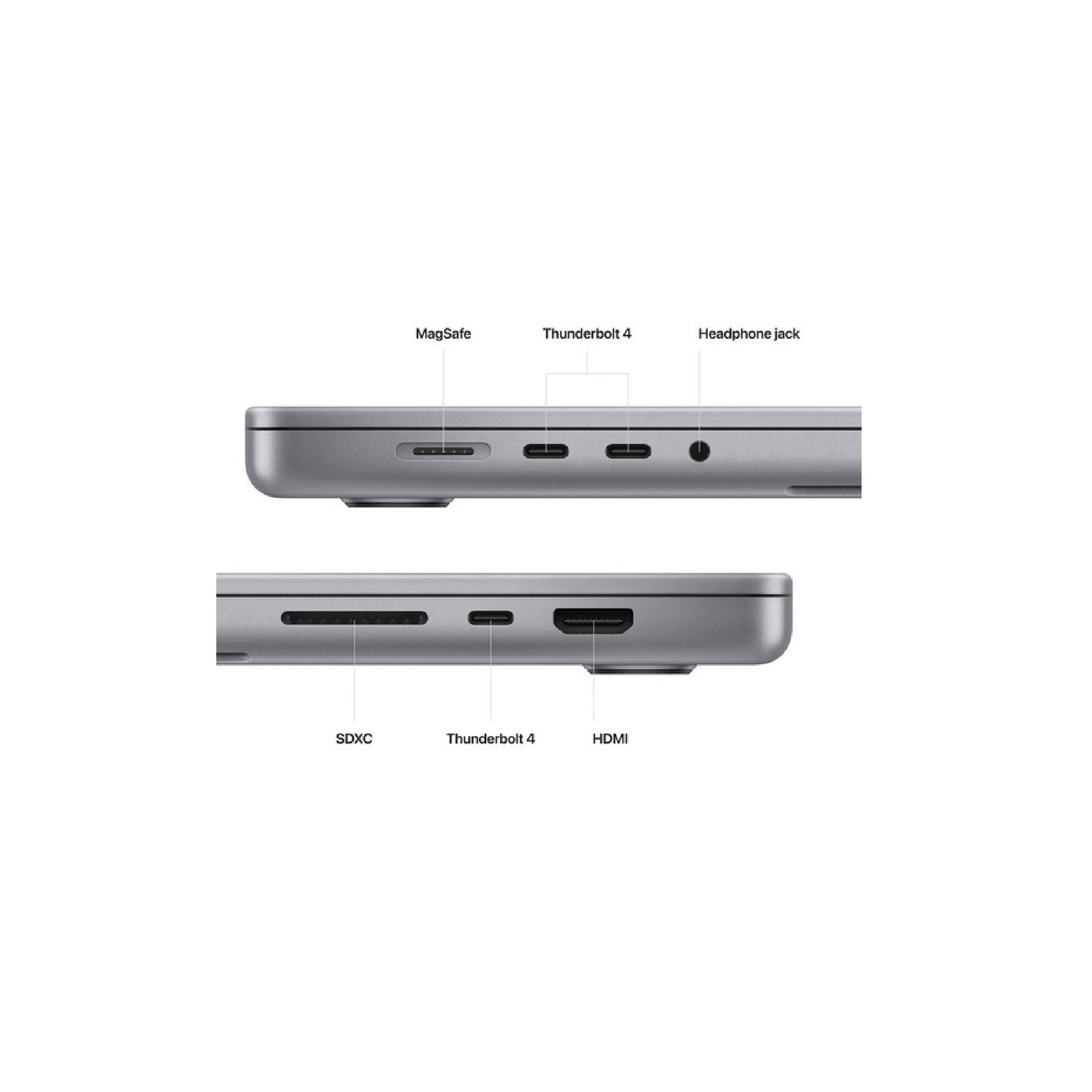 Transfer photos and videos with an SDXC card reader. Connect to TVs or displays with HDMI output. Listen using a 3.5mm headphone jack that detects and automatically adjusts for high‑impedance headphones. Connect to high-speed peripherals or displays with three Thunderbolt 4 ports. And fast‑charge using the quick‑releasing MagSafe 3 port.