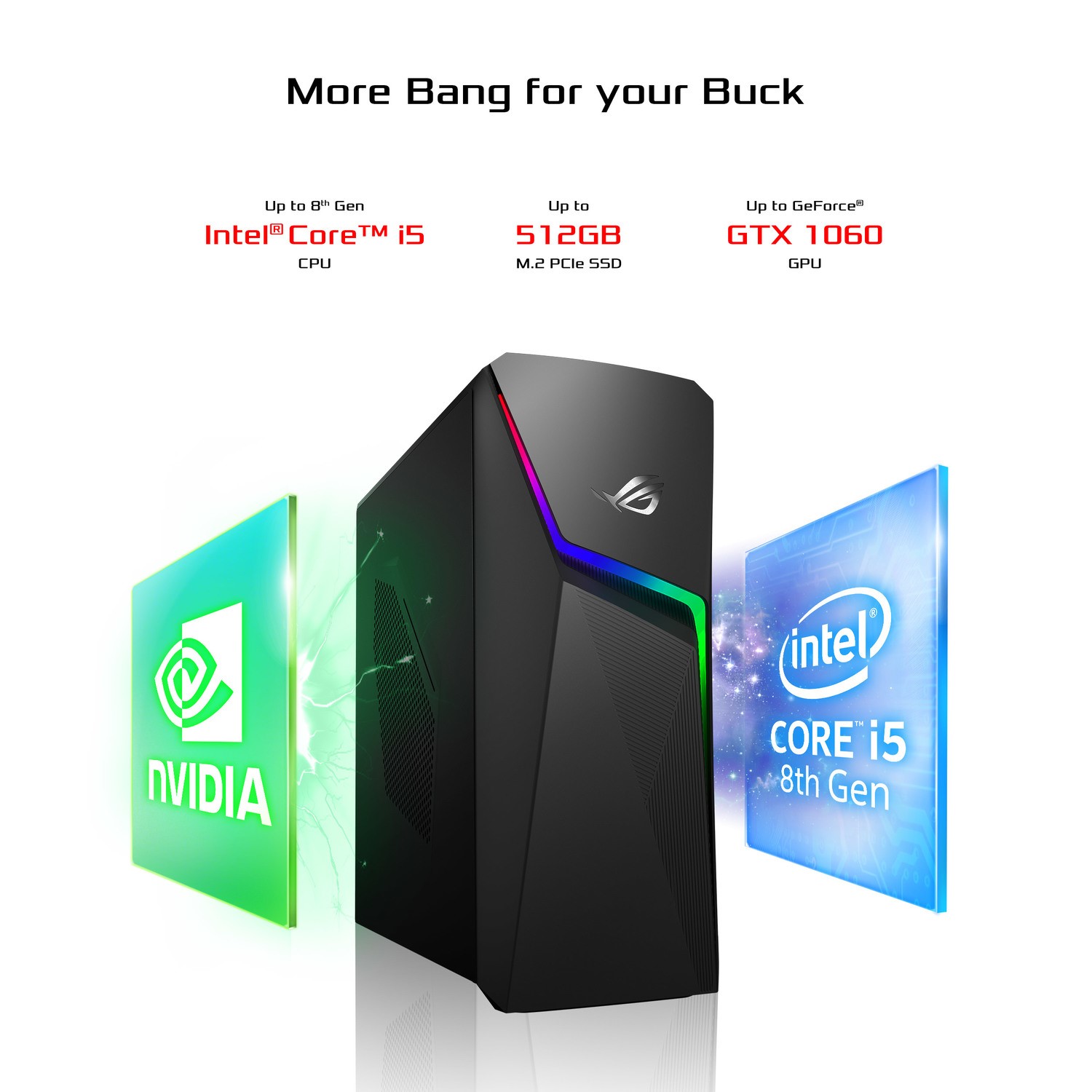 Upgrade from the last generation with the new ROG Strix GL10, a Windows 10 gaming desktop that delivers exhilirating gaming experiences powered by an 8th Generation Intel Core i5-8400 processor and NVIDIA GeForce GTX 1060 graphics.