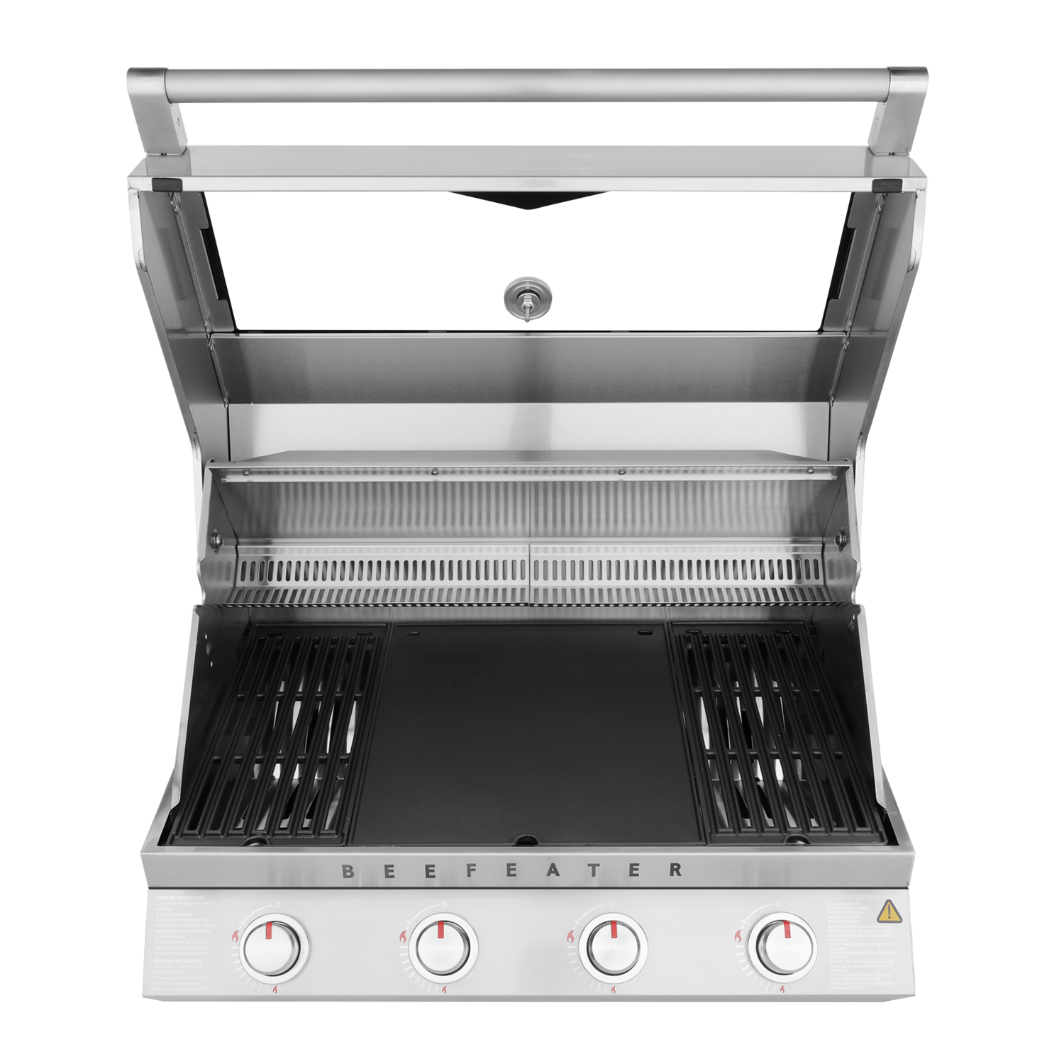 Engineered for power and precision, this barbecue features durable 4.2kW cast iron burners paired with stainless steel vaporisers for even heat distribution and consistent performance. The cast iron hotplate and split grills offer versatile cooking options, while a full-width oil and fat catchment tin on smooth telescopic runners ensures easy cleaning. A double-layered hood with a glass viewing window and integrated temperature gauge lets you monitor your cook with ease, and the stainless steel firebox with external seam weld delivers lasting strength and durability.