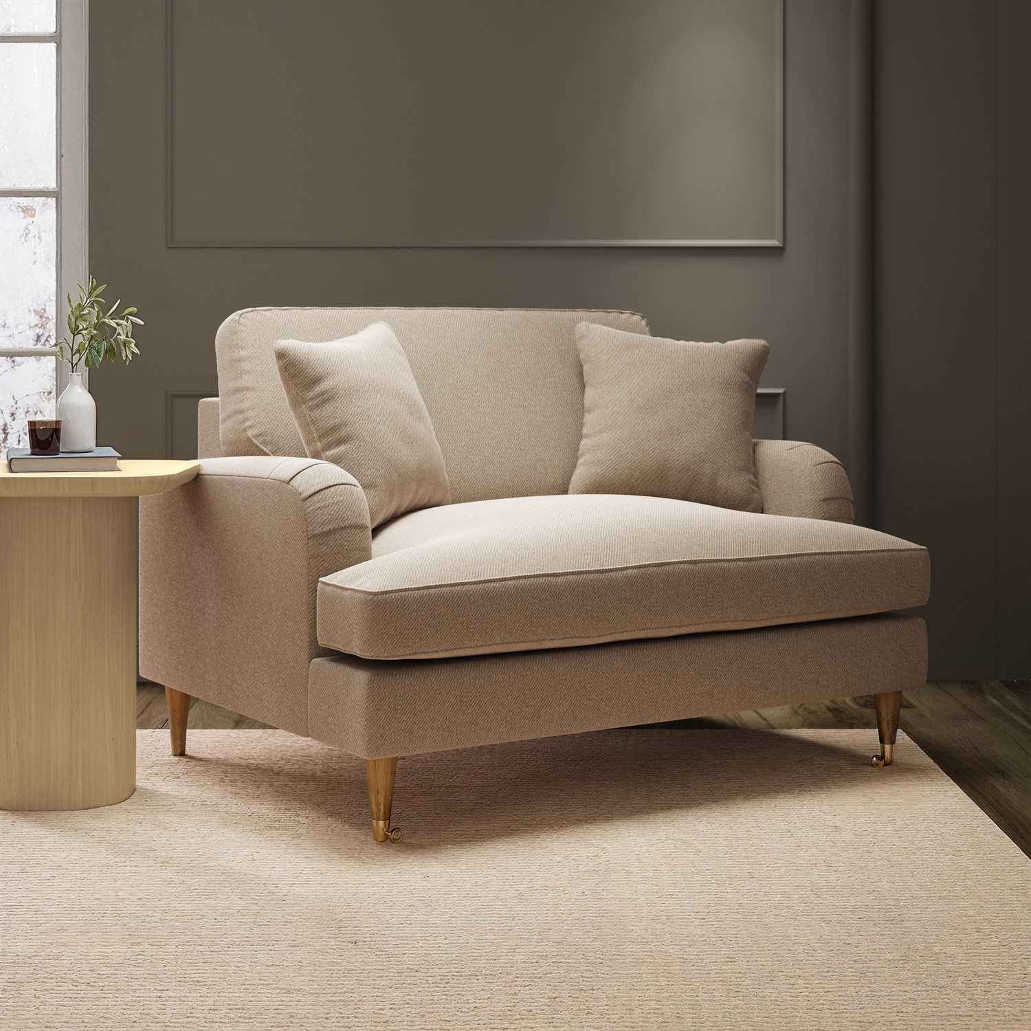Sink into the ultimate snuggle spot with our Payton cuddle chair, perfect for two people to cuddle up together. It comes with two matching throw cushions to help tailor your seating position for optimum comfort. The front legs feature castors to make it easy to move around, while the back legs hold it in place. The castor wheels can't be removed from the legs. Check out our upholstery care kit to keep your loveseat in tip-top condition. Dark wood legs are available to purchase on this love seat, just add yours from our package deals, recommended accessories or at checkout. The Payton beige woven range is delivered with light oak legs as standard.