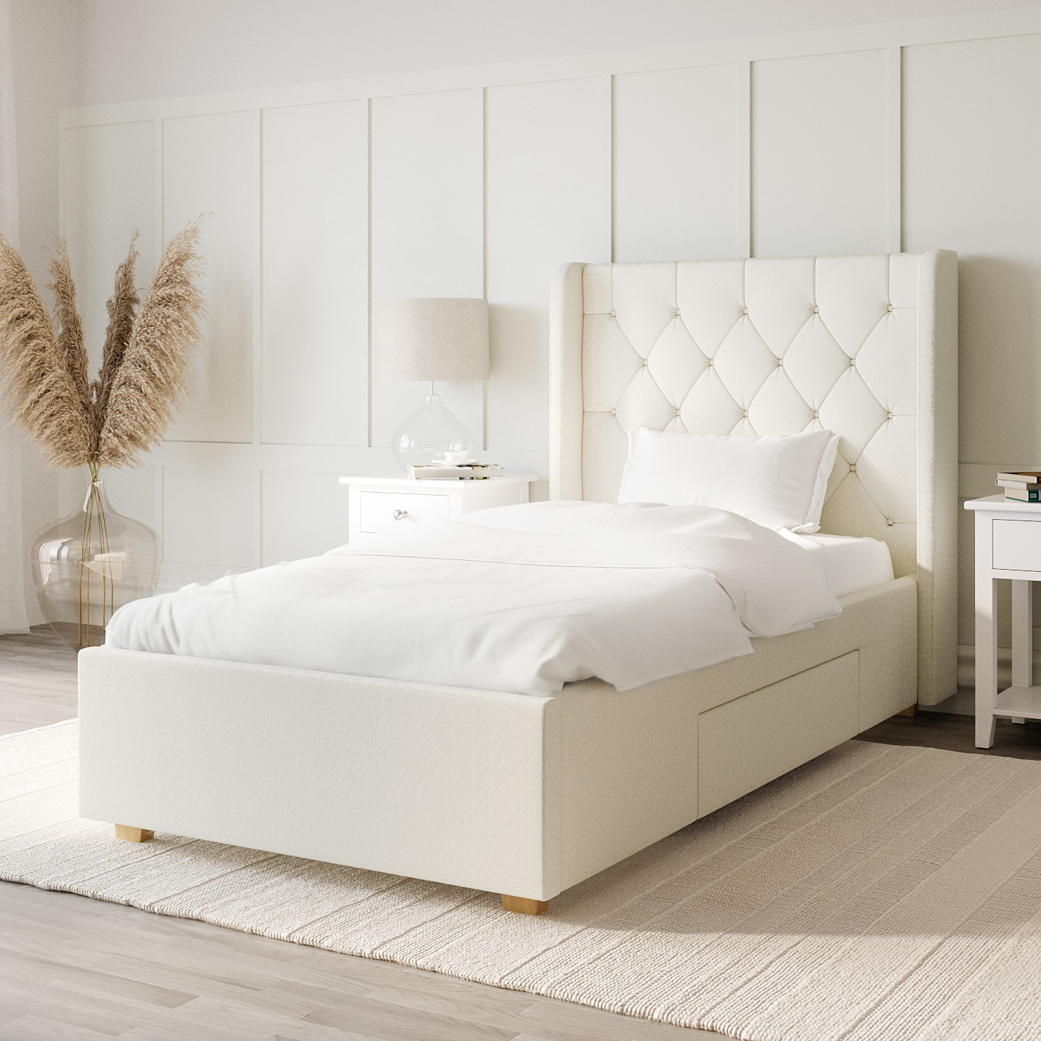 Make a stunning impression in any bedroom with this gorgeous single bed. The timeless Chesterfield design features button tuft detailing on the headboard and a padded and upholstered finish. It features a large drawer that’s easy to slide out, ideal for folded items, bed linen and keeping clutter at bay. Made with wood and metal and supported by chunky yet discreet light wood legs, it’s made to last. It fits a UK single mattress, which isn’t included, so you’re free to choose a mattress that’s perfect for you.